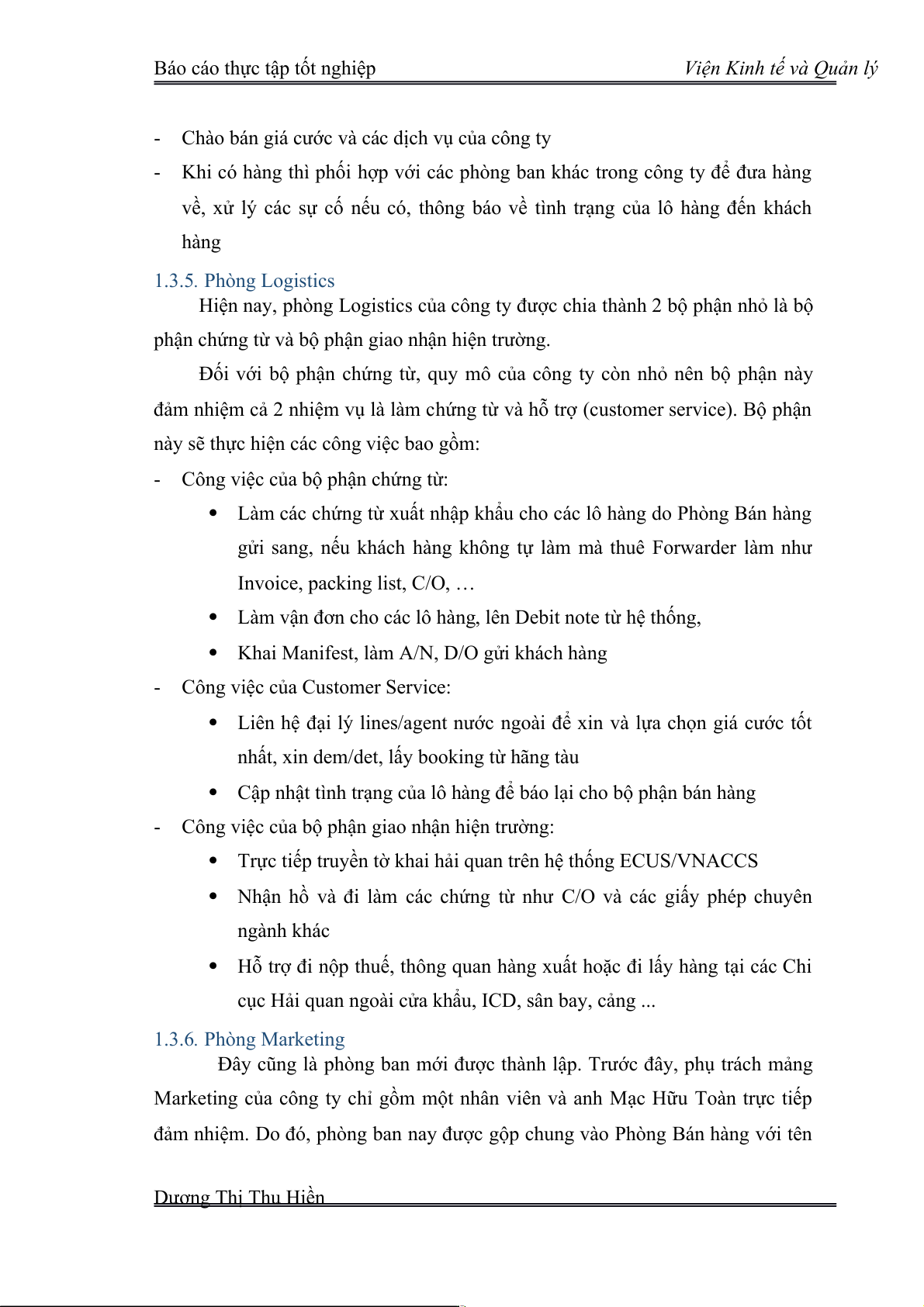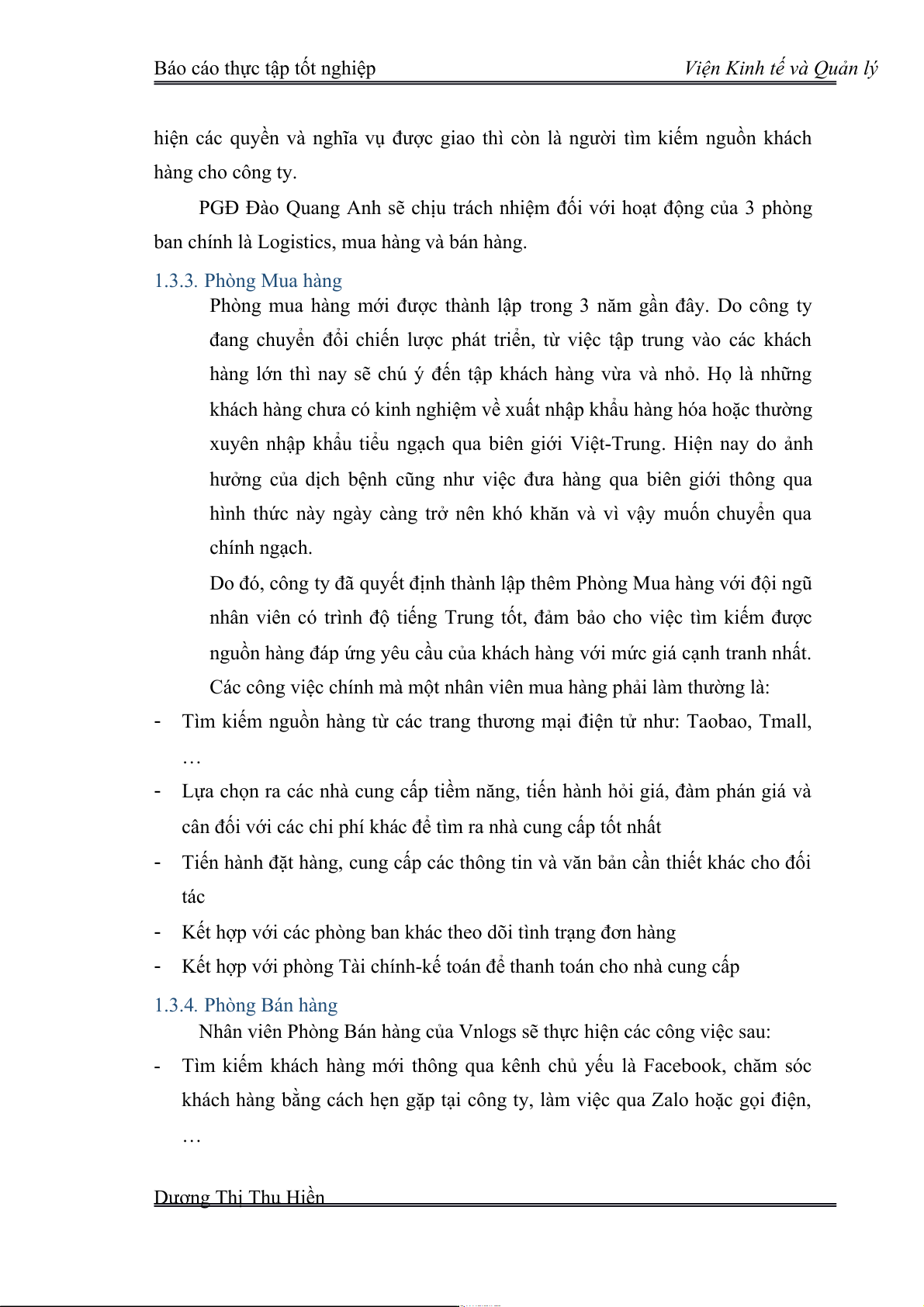 đảm nhiệm. Do đó, phòng ban nay được gộp chung vào Phòng Bán hàng với tên Dương Thị Thu Hiền