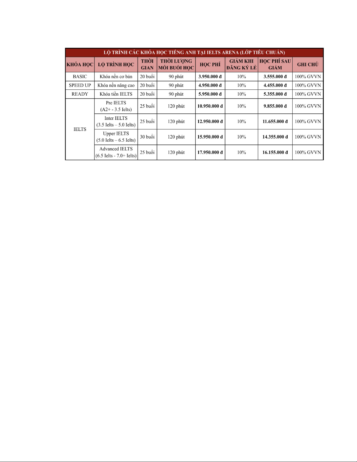 Hình 2.1 Chính sách giá khoá học của IELTS ARENA