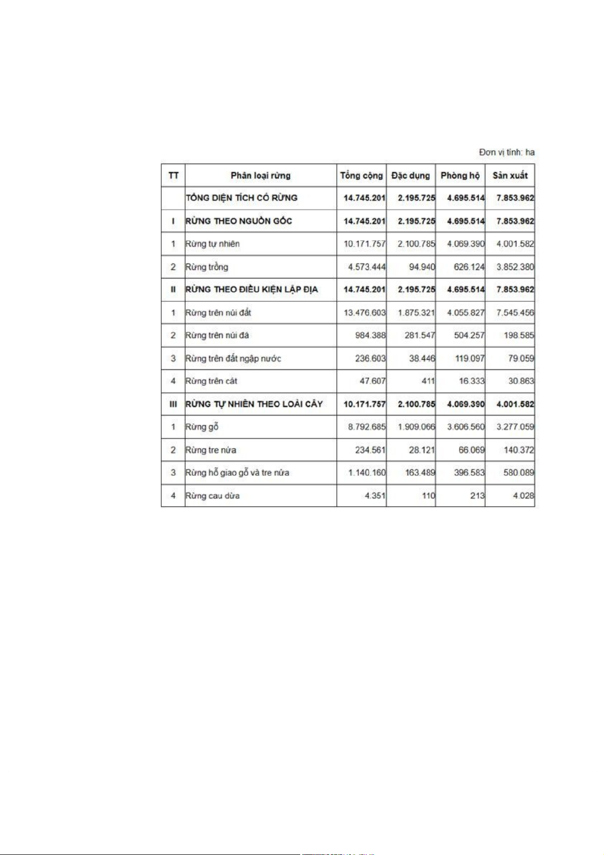 tổng số diện tích rừng ở nước ta, khi con số này lần lượt là 4163 ha, 8063 ha, và 2051
