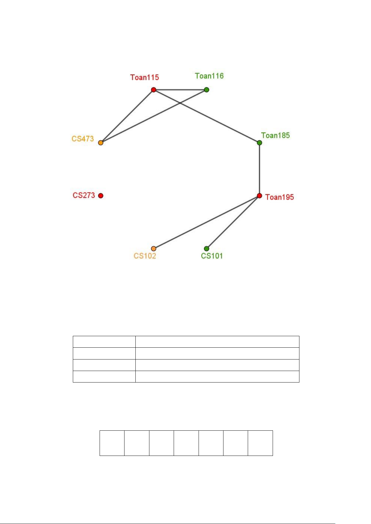 Các cặp môn không thể thi cùng một đợt sẽ tạo thành các cạnh trong đồ thị:  •  (Toán 115, CS 473)  •  (Toán 116, CS 473)  •  (Toán 195, CS 101)  •  (Toán 195, CS 102)  •  (Toán 115, Toán 116)  •  (Toán 115, Toán 185)  •  (Toán 185, Toán 195)