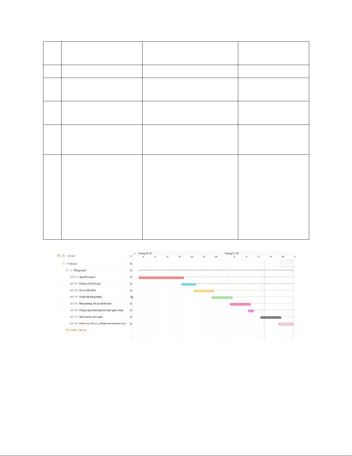 STT Tên nhiệm vụ Khoảng thời gian Nguồn sử dụng 1 Tạo thông số kĩ thuật 2 tuần Microsoft word 2 Xây dựng kế hoạch 5 ngày Bảng nhiệm vụ Bảng kế hoạch 3 Bảng sơ đồ khối 1 tuần Microsoft vision 4 Thiết kế từng khối, 1 tuần Proteus Tinkercab 5