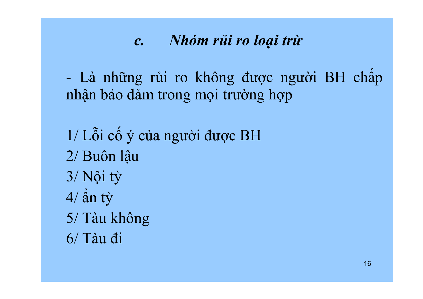 1/ Lỗi cố ý của người được BH 2/ Buôn lậu 3/ Nội tỳ 4/ ẩn tỳ 5/ Tàu không 6/ Tàu đi 16 c.