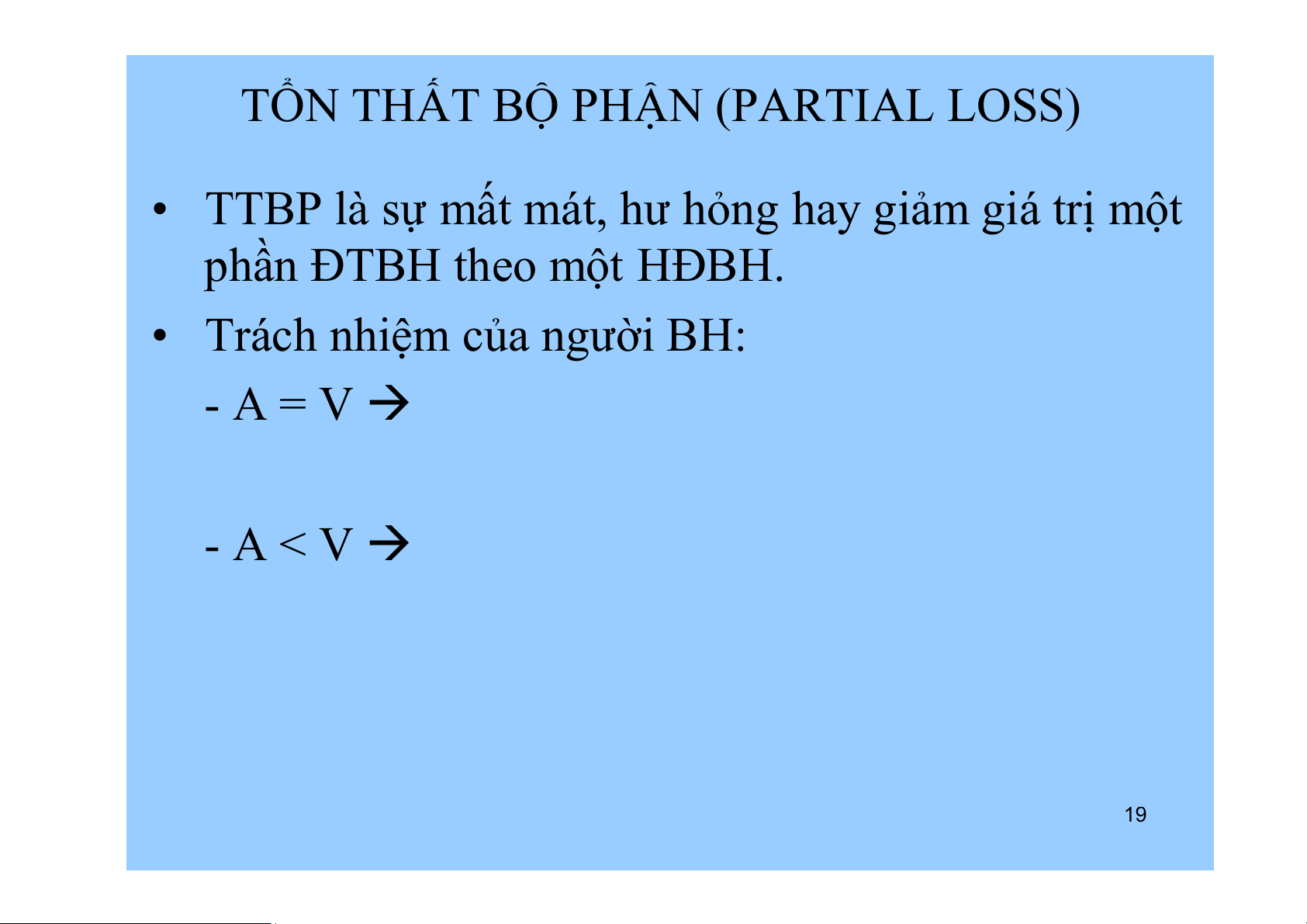 • Trách nhiệm của người BH: - A = V - A < V 19