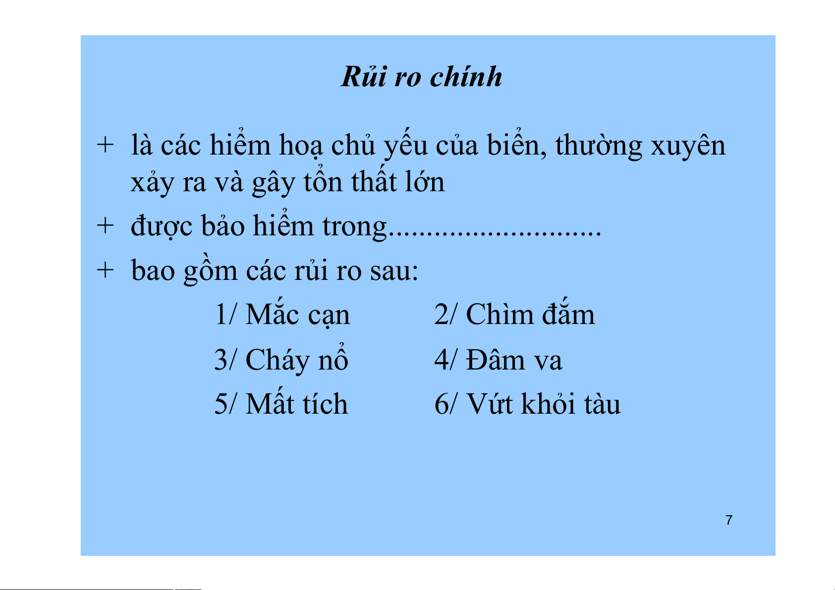 thường theo các ĐKBH gốc - Hai loại: + Rủi ro chính + Rủi ro phụ 6 Rủi ro chính