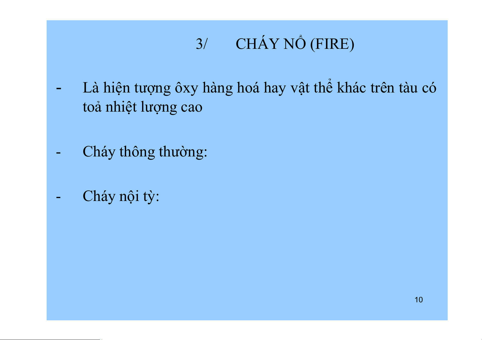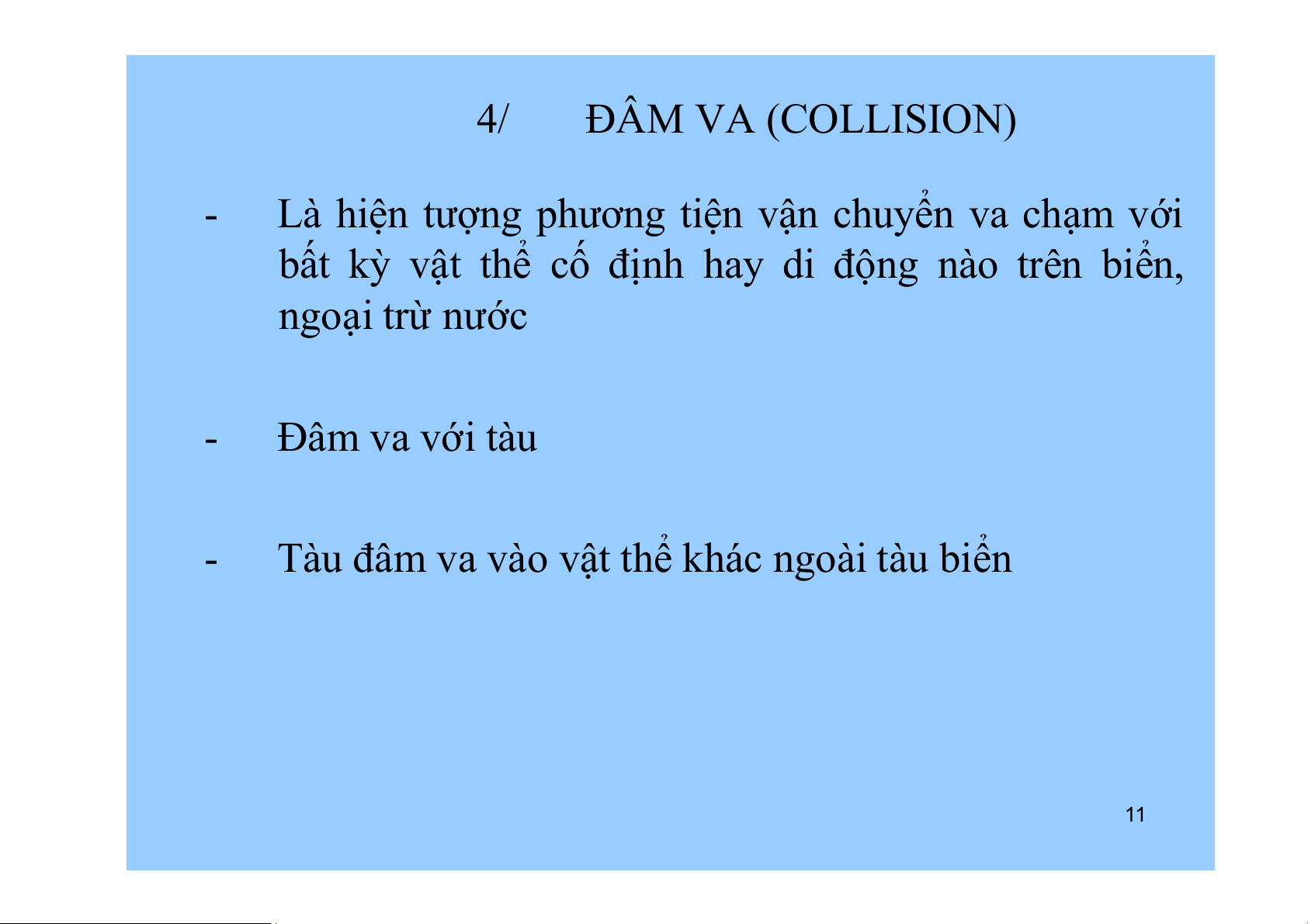 Là hiện tượng ôxy hàng hoá hay vật thể khác trên tàu có toả nhiệt lượng cao - Cháy thông thường: - Cháy nội tỳ: 10 4/ ĐÂM VA (COLLISION) -