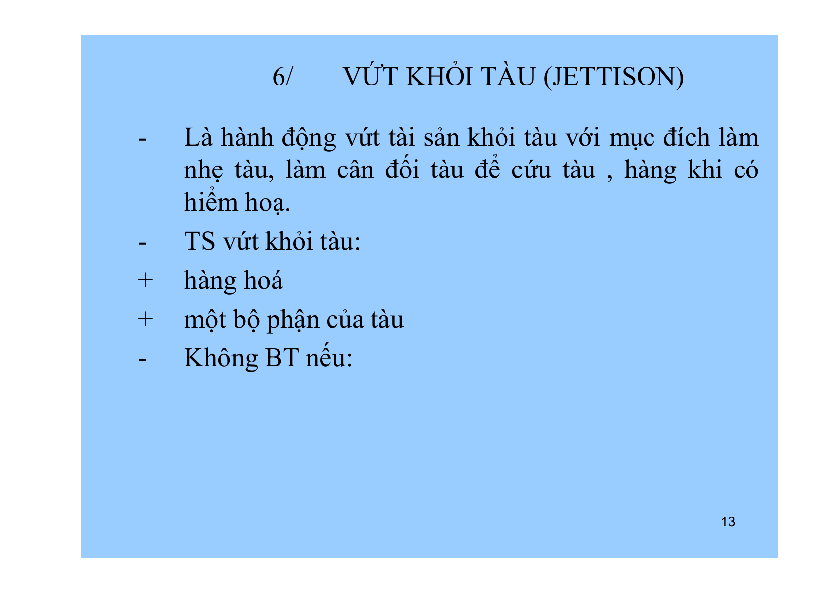 nhẹ tàu, làm cân đối tàu để cứu tàu , hàng khi có hiểm hoạ. - TS vứt khỏi tàu: + hàng hoá + một bộ phận của tàu - Không BT nếu: 13 Rủi ro phụ -