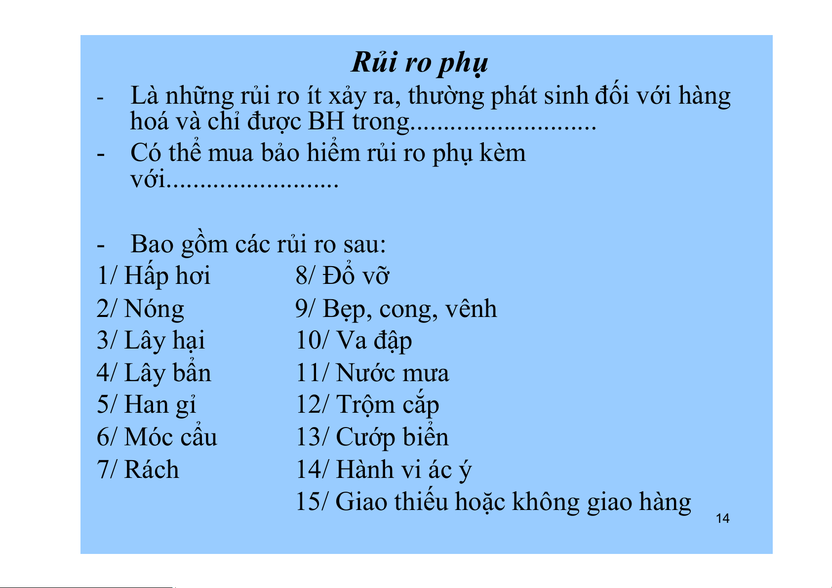 với.......................... - Bao gồm các rủi ro sau: 1/ Hấp hơi 8/ Đổ vỡ 2/ Nóng 9/ Bẹp, cong, vênh 3/ Lây hại 10/ Va đập 4/ Lây bẩn 11/ Nước mưa 5/ Han gỉ 12/ Trộm cắp 6/ Móc cẩu 13/ Cướp biển 7/ Rách 14/ Hành vi ác ý