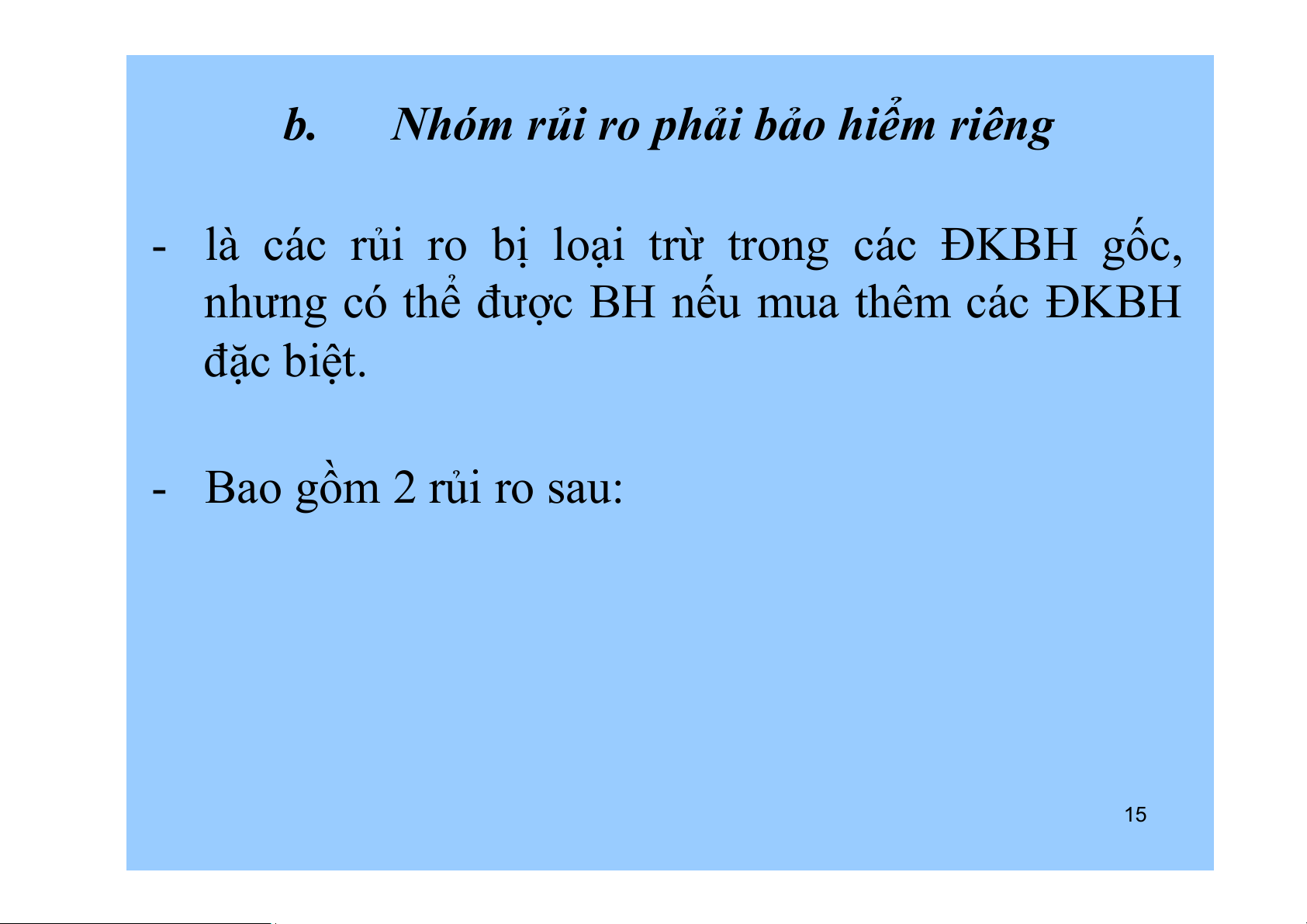 nhưng có thể được BH nếu mua thêm các ĐKBH đặc biệt. - Bao gồm 2 rủi ro sau: 15 c.