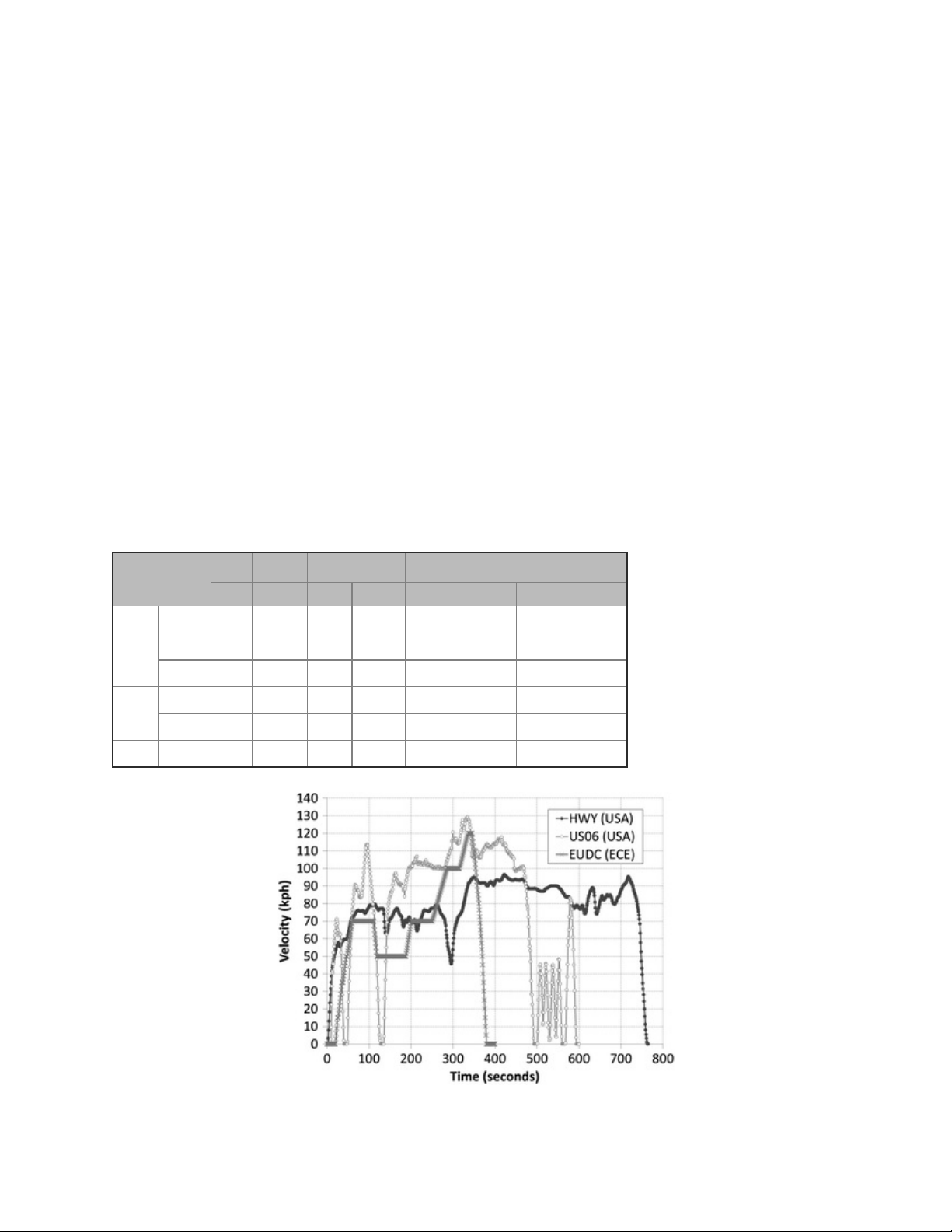 Time Length Speed (kph) Absolute acceleration (m/sec2) (sec) (km) Avg Max Avg Max USA UDDS 1369 11.99 31.51 91.25 0.40 1.48 HWY 765 16.51 77.58 96.40 0.17 1.48 US06 596 12.89 77.86 129.23 0.61 3.76 EU EUC 195 0.99 18.26 50 0.27 1.06 EUDC 400 62.44 62.44 120 0.19 1.39 Japan 10–15 892 25.58 25.58 70 0.27 0.83
