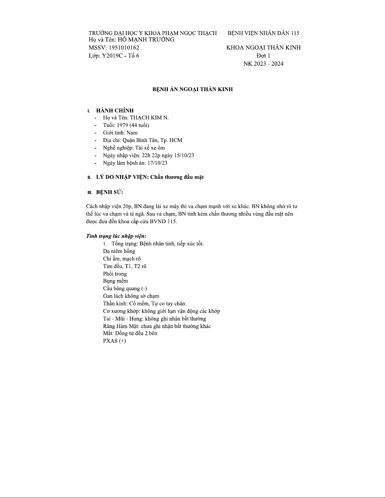 BỆNH ÁN NGOẠI THẦN KINH - Y2019C - Tổ 6 - Đợt 1 (NK 2023-2024)