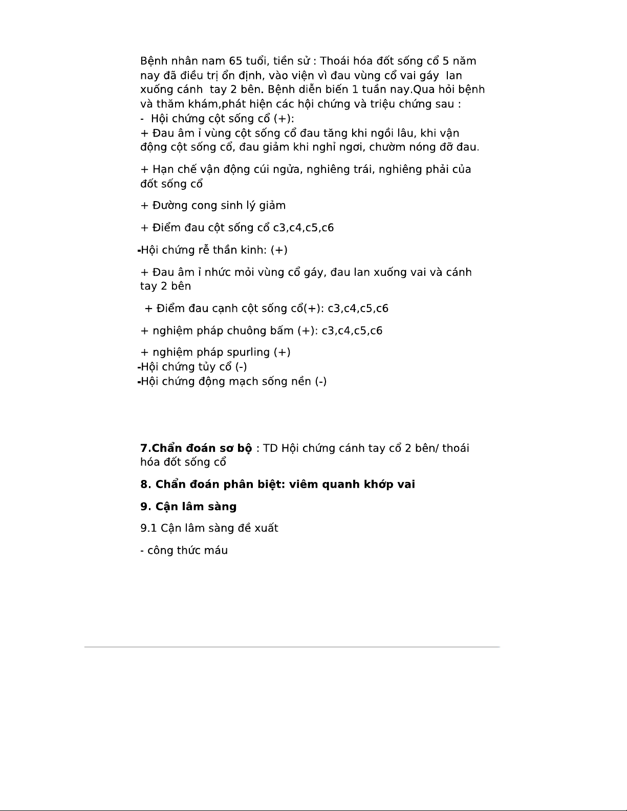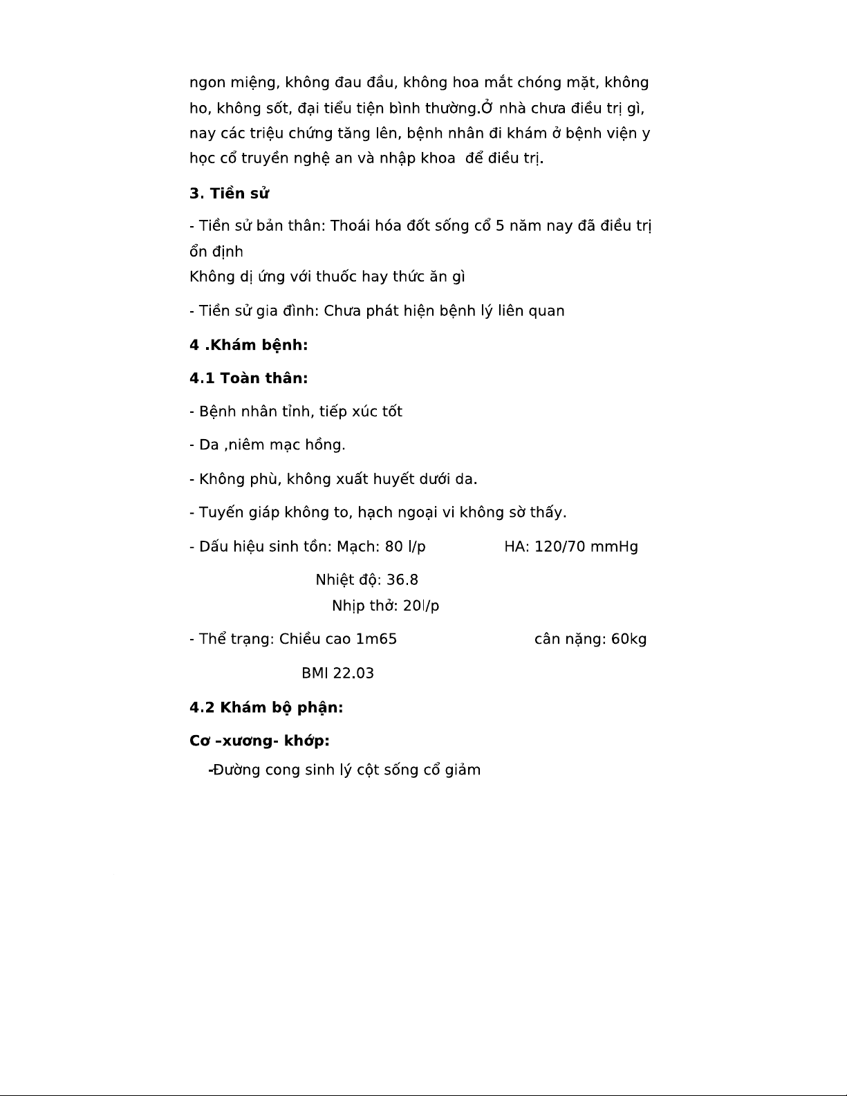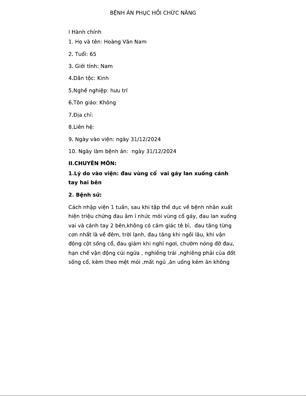 Bệnh án phục hồi chức năng cho bệnh nhân 65 tuổi: Thoái hóa đốt sống cổ