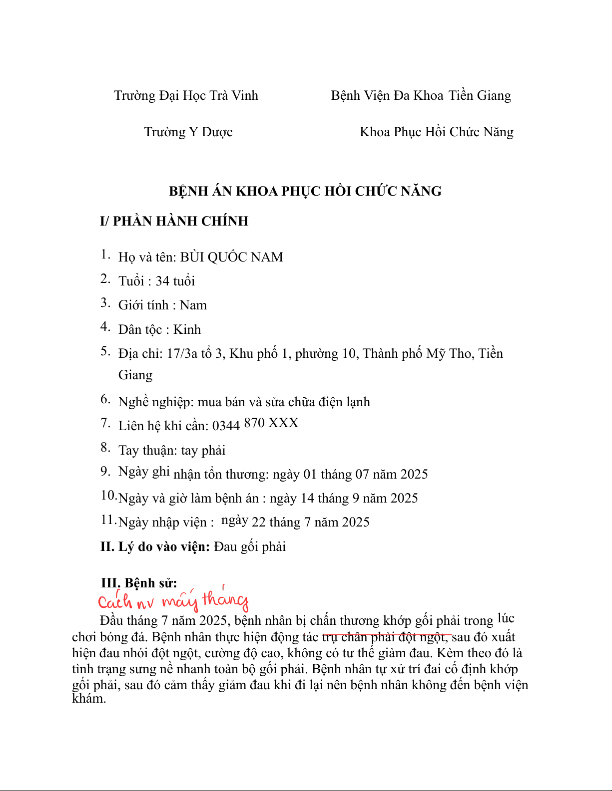 Đầu tháng 7 năm 2025, bệnh nhân bị chấn thương khớp gối phải trong lúc