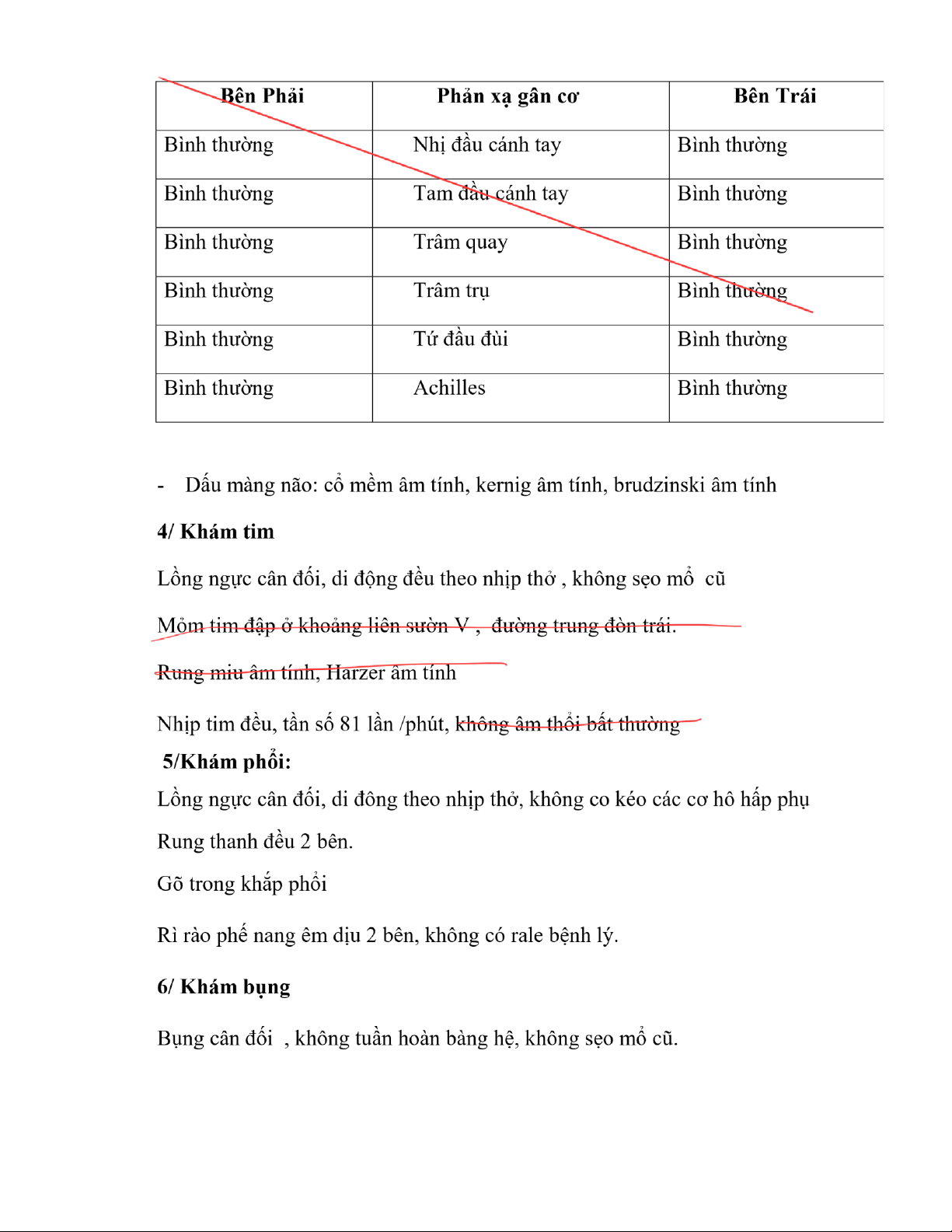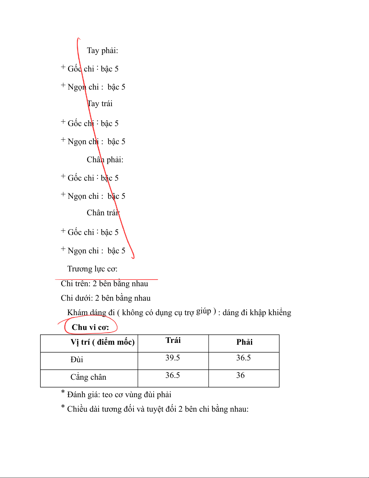 + Đứng: hơi nghiêng về bên trái Thử cơ bằng tay: lOMoAR cPSD| 45470709 Tay phải: + Gốc chi : bậc 5 + Ngọn chi : bậc 5 Tay trái + Gốc chi : bậc 5 + Ngọn chi : bậc 5 Chân phải: + Gốc chi : bậc 5 + Ngọn chi : bậc 5 Chân trái: + Gốc chi : bậc 5 + Ngọn chi : bậc 5 Trương lực cơ: Chi trên: 2 bên bằng nhau