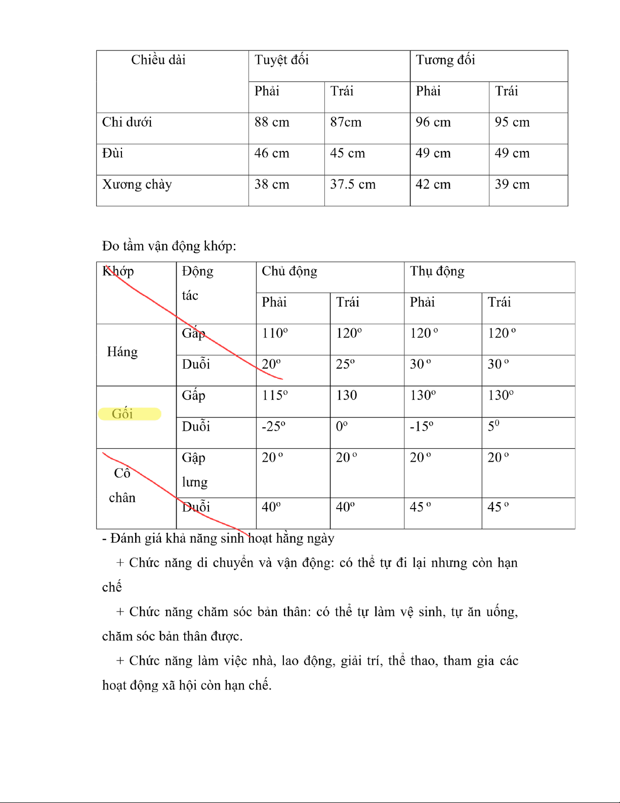 hạn chế vận động khớp gối phải, không thể gập duỗi hết biên độ.