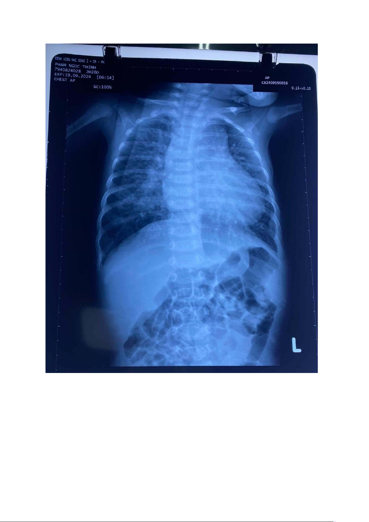 Khám (20h30, 24/09) 1/ Tổng trạng: + Em quấy, khóc. + Sinh hiệu: Mạch rõ, 140 lần/phút Nhiệt ộ: 37 ộ C SpO2 tay P - chân P: 97%
