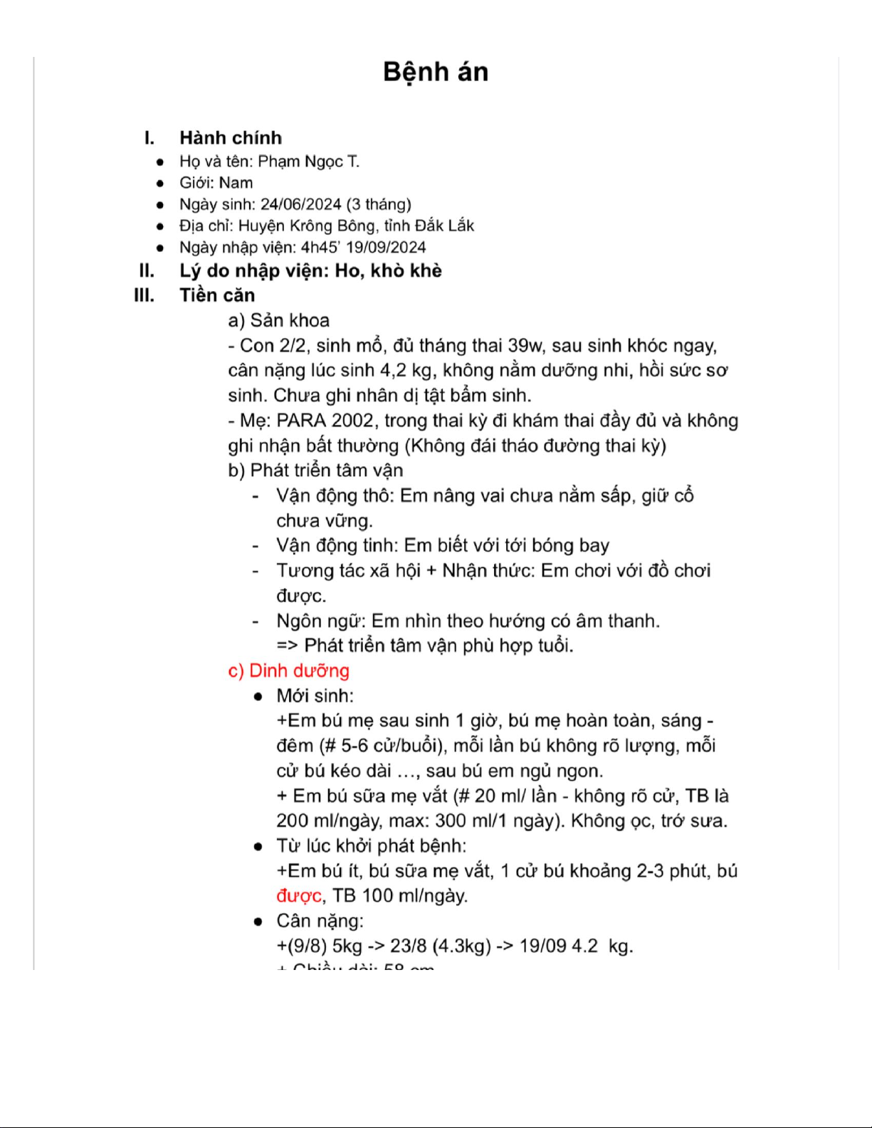 Lý do nhập viện: Ho, khò khè III. Tiền căn a) Sản khoa - Con 2/2, sinh mổ,