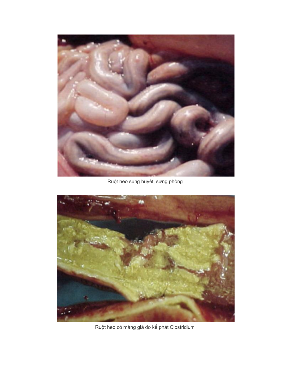 nhẹ: ruột heo sưng phồng và hơi cương lên. Thi thoảng thấy một vài vệt máu đông xuất hiện trên niêm mạc ruột.