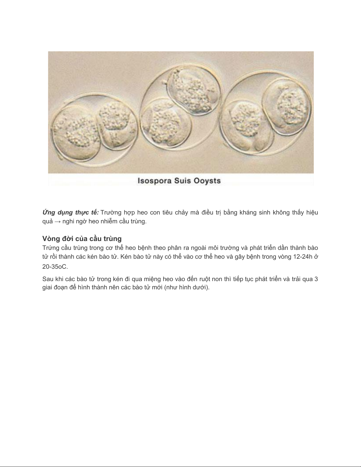Mầm bệnh cầu trùng heo gồm có 3 loại, loại 1 tên là Isospora, gây bệnh chủ yếu cho heo con từ 7-