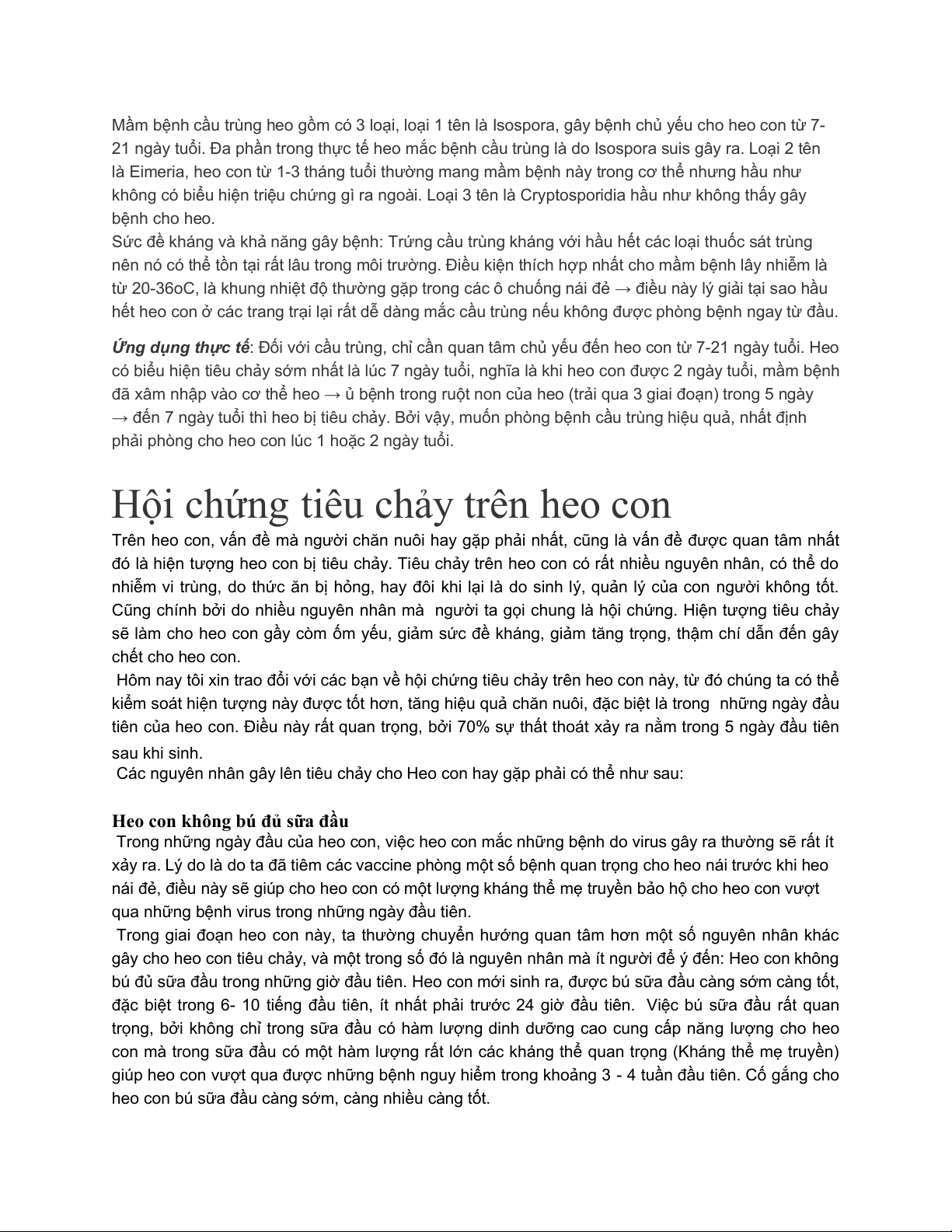 Ứng dụng thực tế: Đối với cầu trùng, chỉ cần quan tâm chủ yếu đến heo con từ 7-21 ngày tuổi. Heo