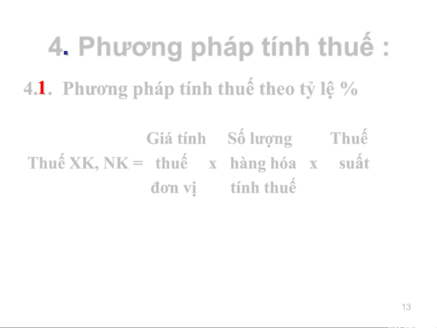 4.1. Phương pháp tính thuế theo tỷ lệ % Giá tính Số lượng Thuế Thuế XK, NK = thuế x hàng hóa x suất đơn vị tính thuế 13