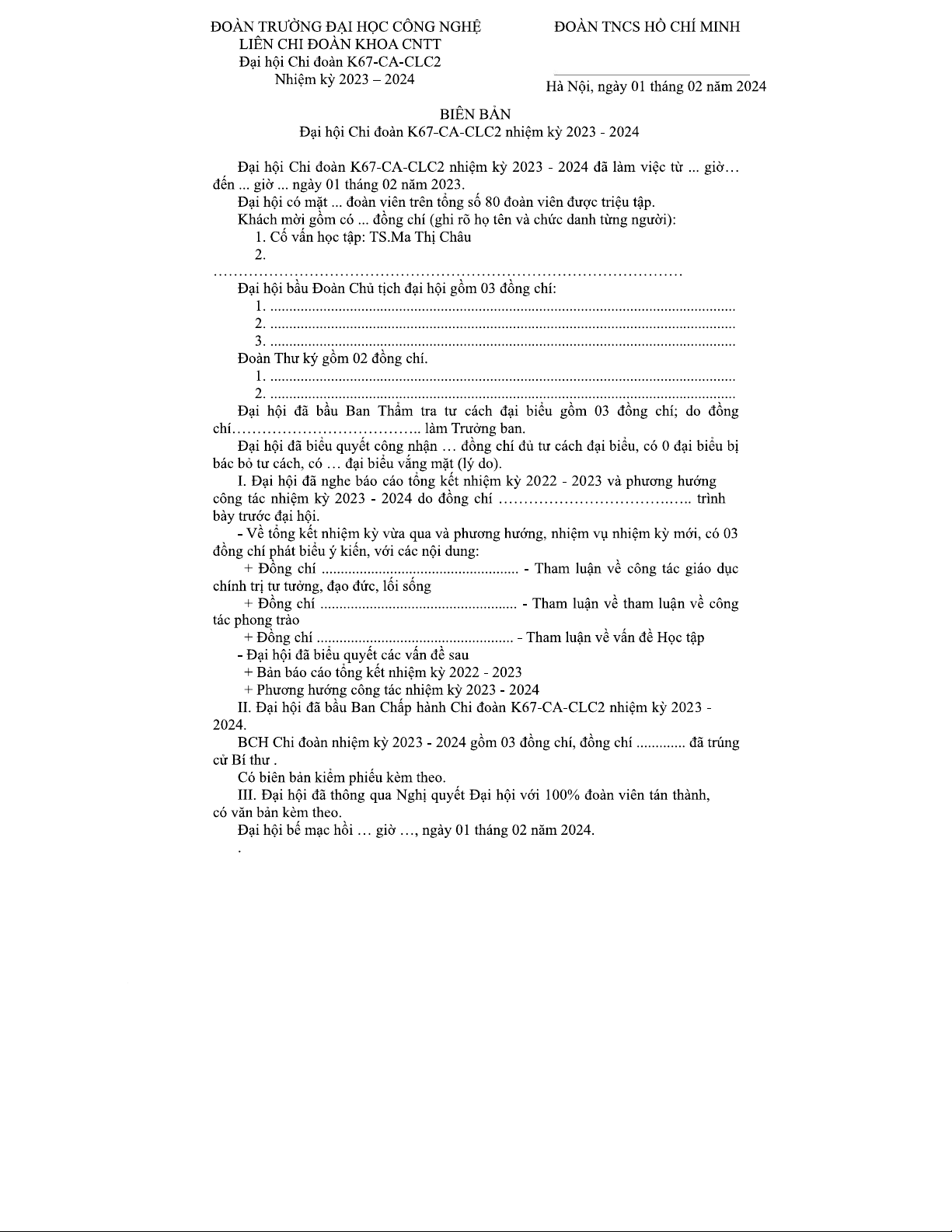 Biên bản Đại hội Chi đoàn K67-CA-CLC Nhiệm kỳ 2023-2024