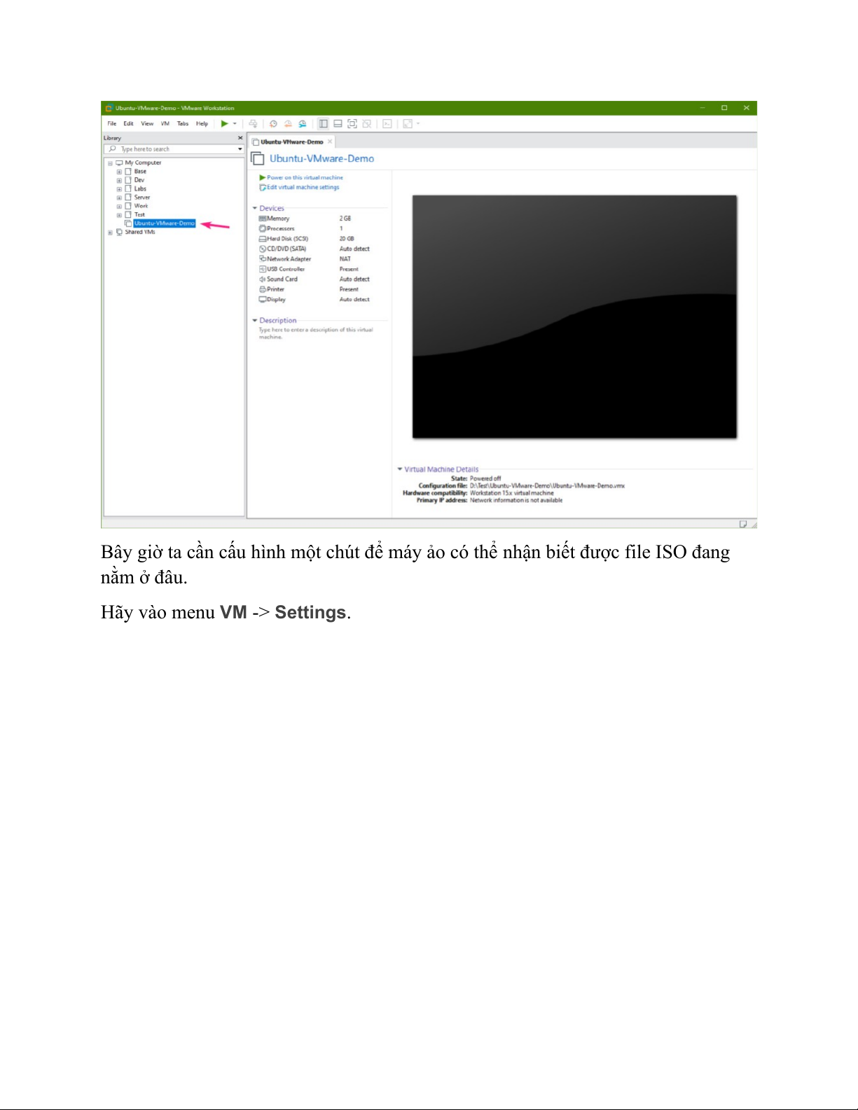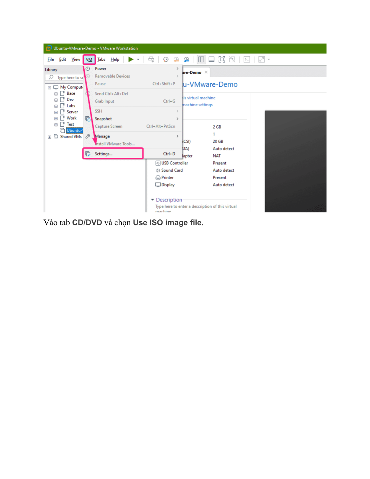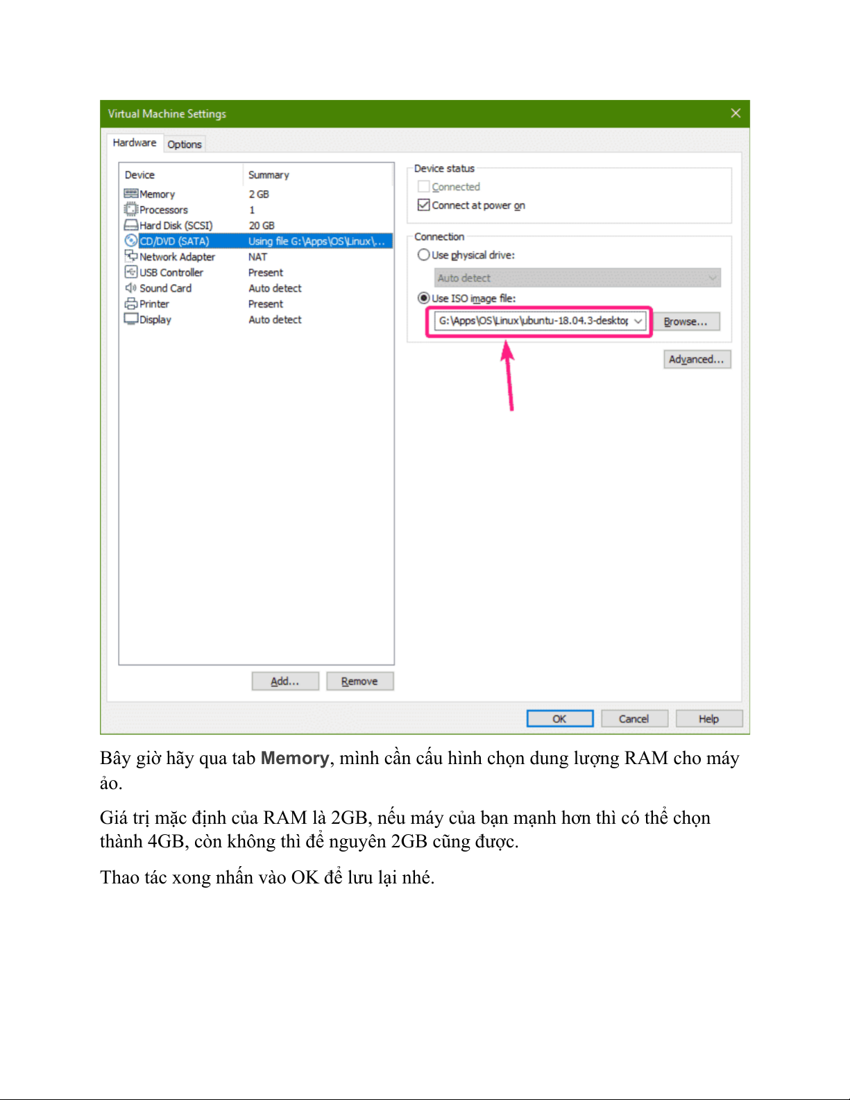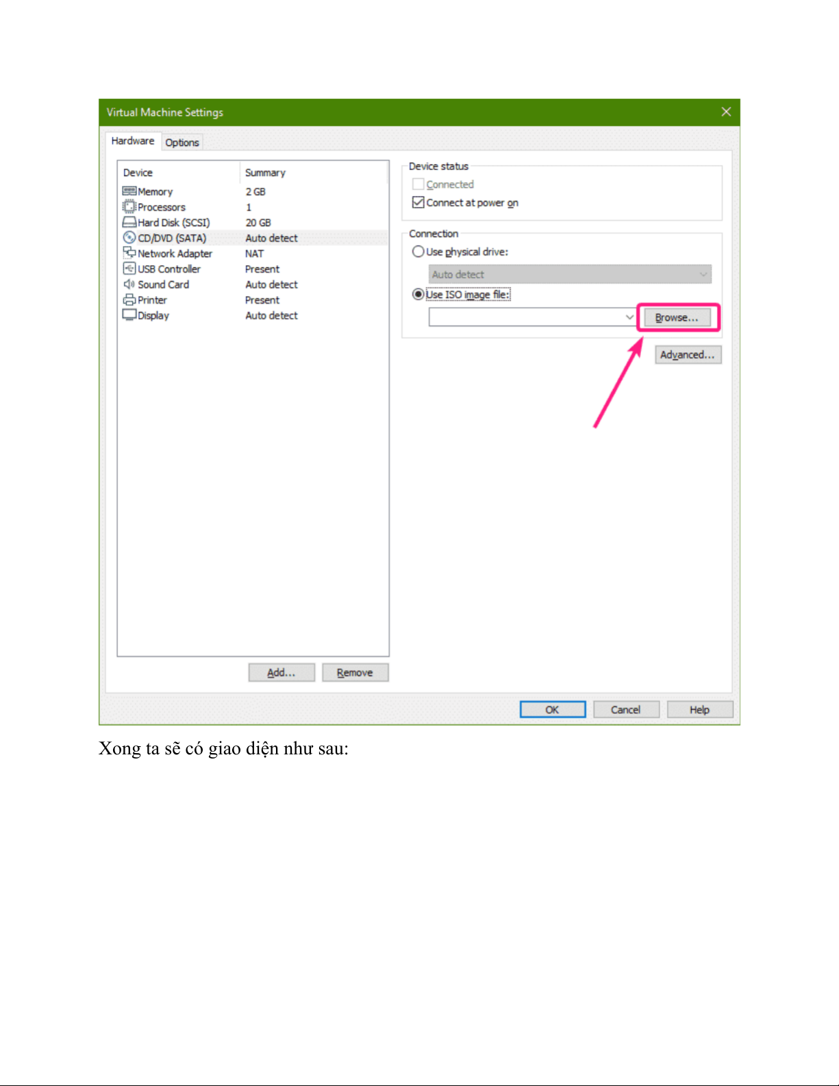 Bây giờ ta cần cấu hình một chút để máy ảo có thể nhận biết được file ISO đang nằm ở đâu.