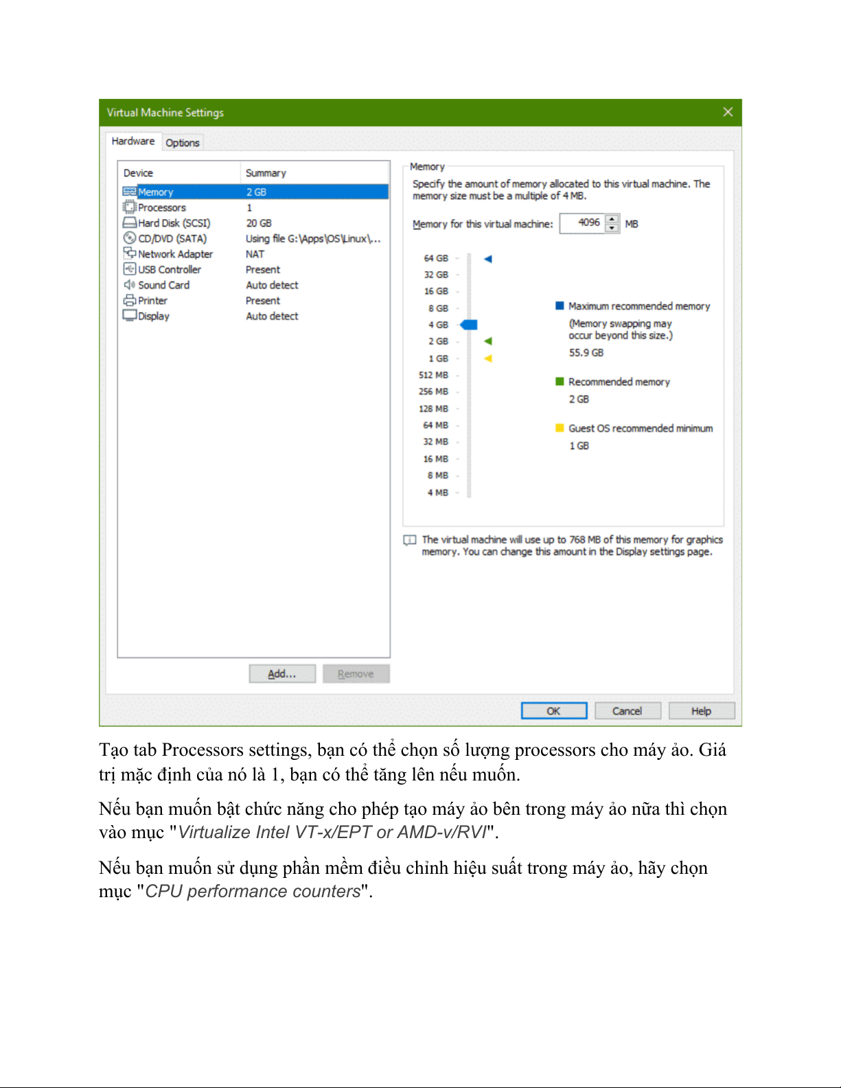 Tạo tab Processors settings, bạn có thể chọn số lượng processors cho máy ảo. Giá