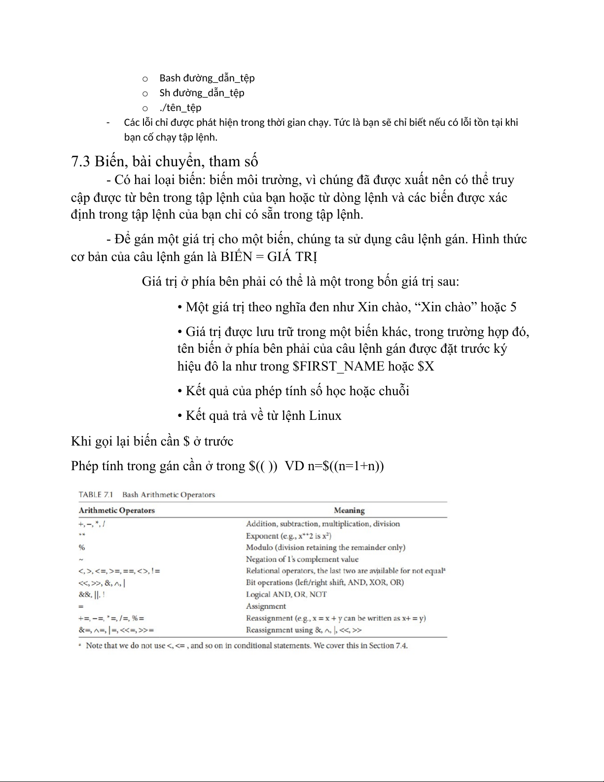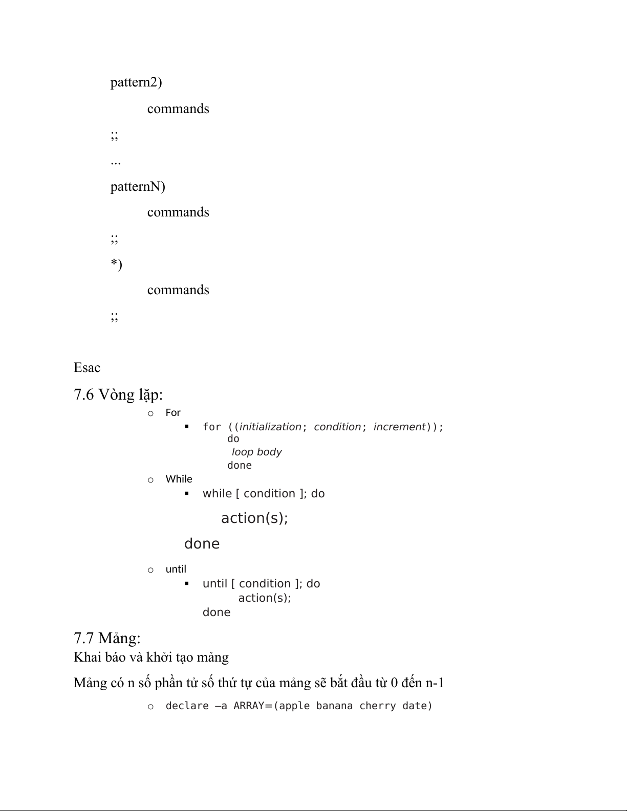 for ((initialization; condition; increment)); do loop body done o While while [ condition ]; do action(s); done o until until [ condition ]; do action(s); done 7.7 Mảng: