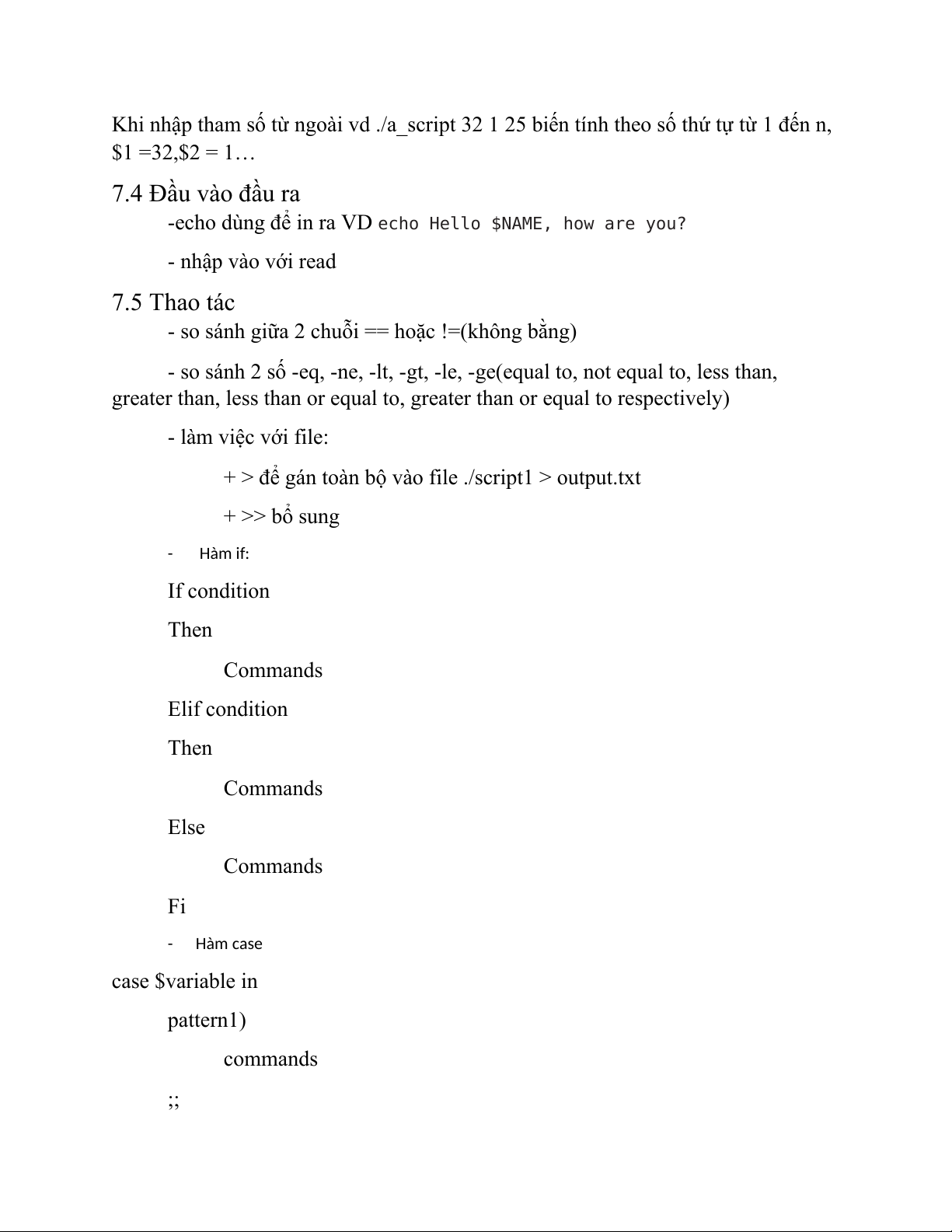 + > để gán toàn bộ vào file ./script1 > output.txt + >> bổ sung - Hàm if: If condition Then Commands Elif condition Then Commands Else Commands Fi - Hàm case case $variable in pattern1) commands ;; pattern2) commands ;; ... patternN) commands ;; *) commands ;; Esac 7.6 Vòng lặp: o For