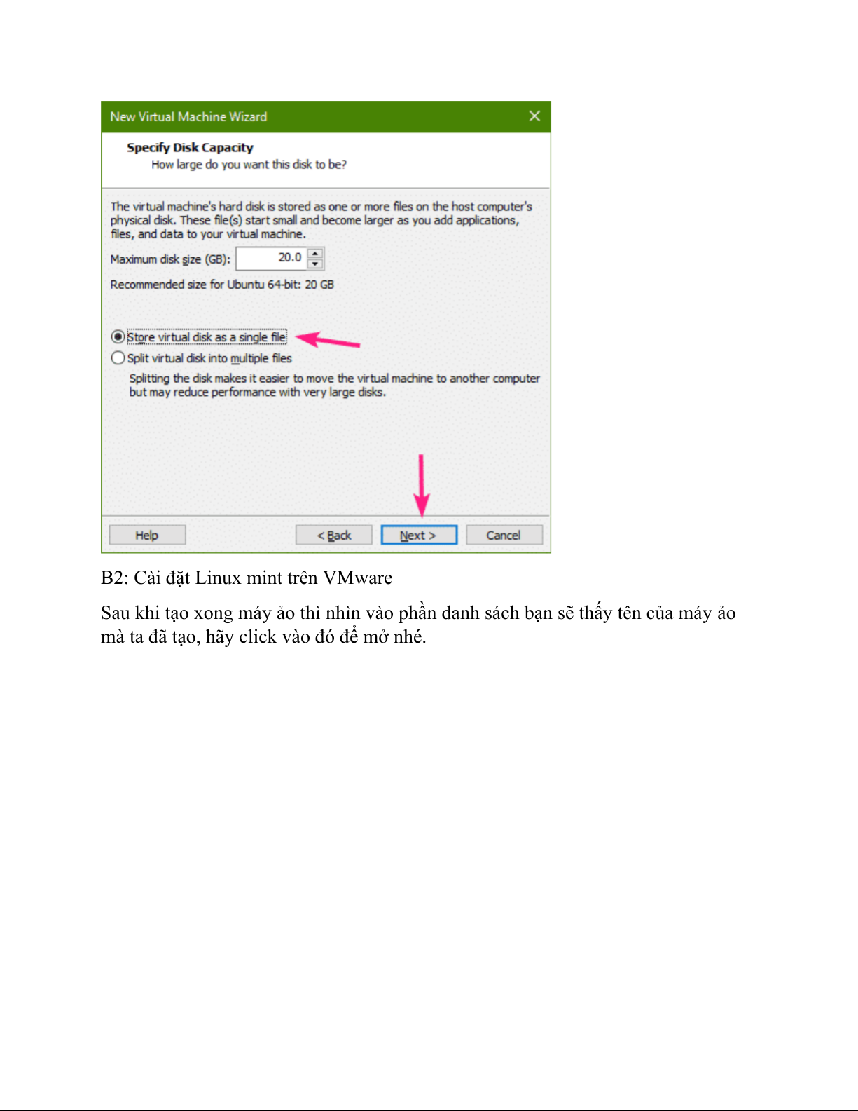 Bước tiếp theo là chọn dung lượng trên ổ đĩa cho máy ảo. Bạn chọn khoảng 20GB,
