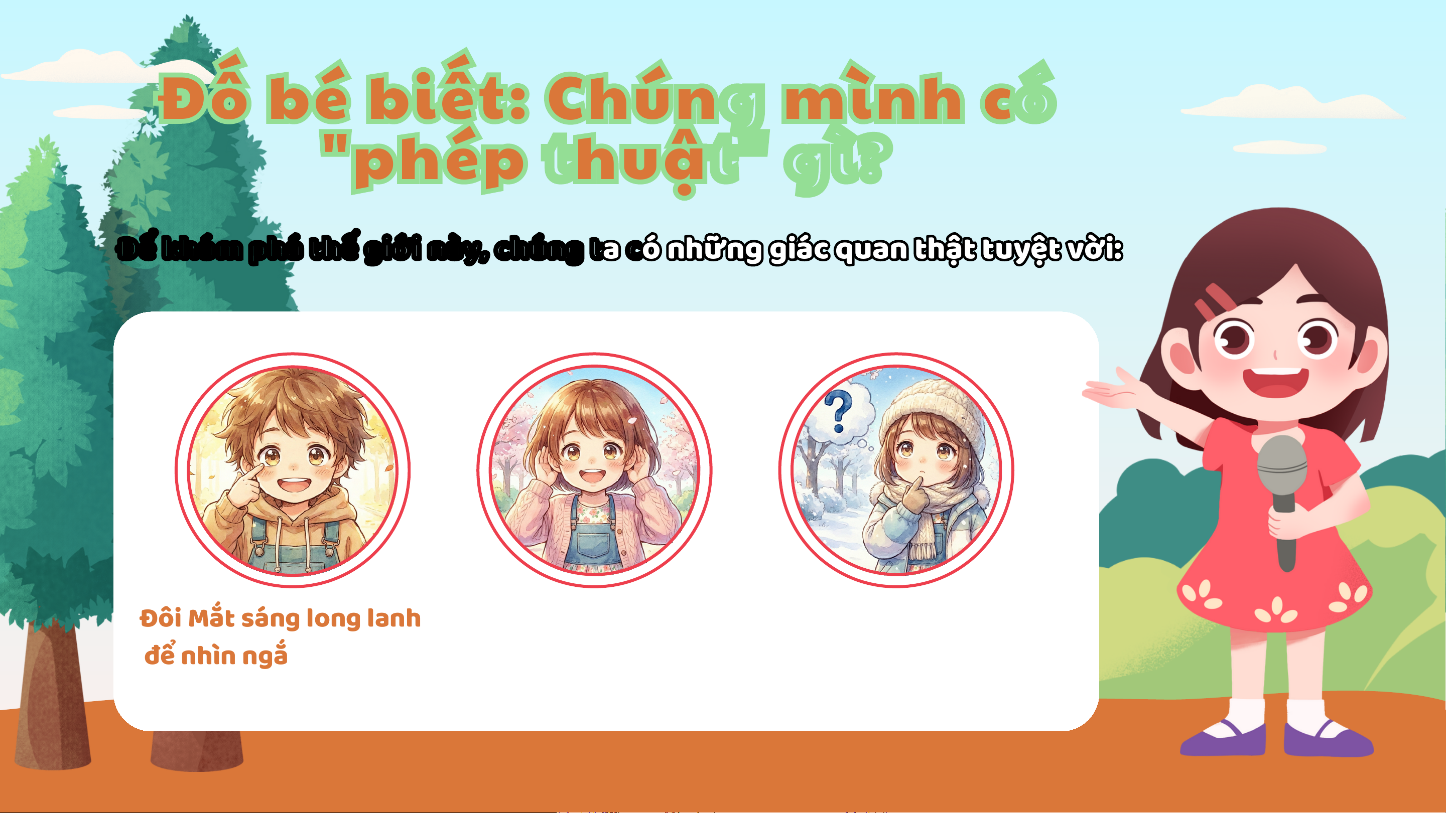Đố bé biết: Chúng mình có "phép thuật" gì? Để Đ ể kh k á h m á m ph p á h á th t ế h ế gi g ớ i i ớ inà n y à , y ch c ú h n ú g n g ta t a có c ó nh n ữ h n ữ g n g gi g á i c á cqu q a u n a n th t ậ h t ậ ttu t y u ệ y t ệ tvờ v i ờ :i Đôi Mắt sáng long lanh Đôi Tai thính nhạy để Và một Bộ não siêu
