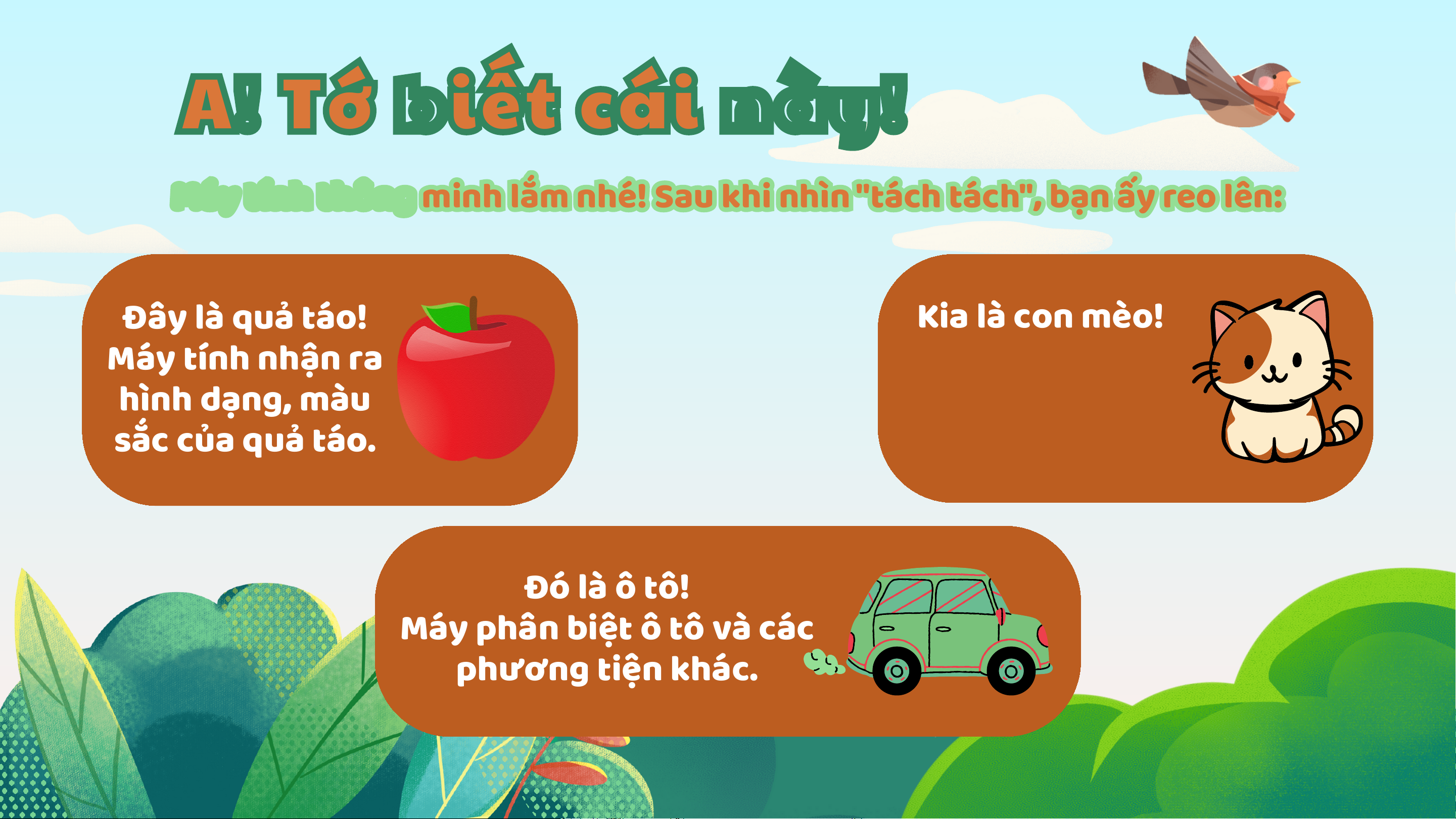 màu vuông tí xíu xiu (người lớn gọi là Pixel). A! Tớ biết cái này! Má M y á y títn í h n h th t ô h n ô g n g mi m n i h n h lắ l m ắ m nh n é h ! é !Sau a u kh k i h inh n ì h n ì n "t " á t c á h c h tá t c á h c " h ," bạn ạ n ấy ấ y re r o e o lê l n ê : n Đây là quả táo! Kia là con mèo! Máy tính nhận ra Máy biết đâu là hình dạng, màu tai, đâu là râu của sắc của quả táo. mèo. Đó là ô tô!