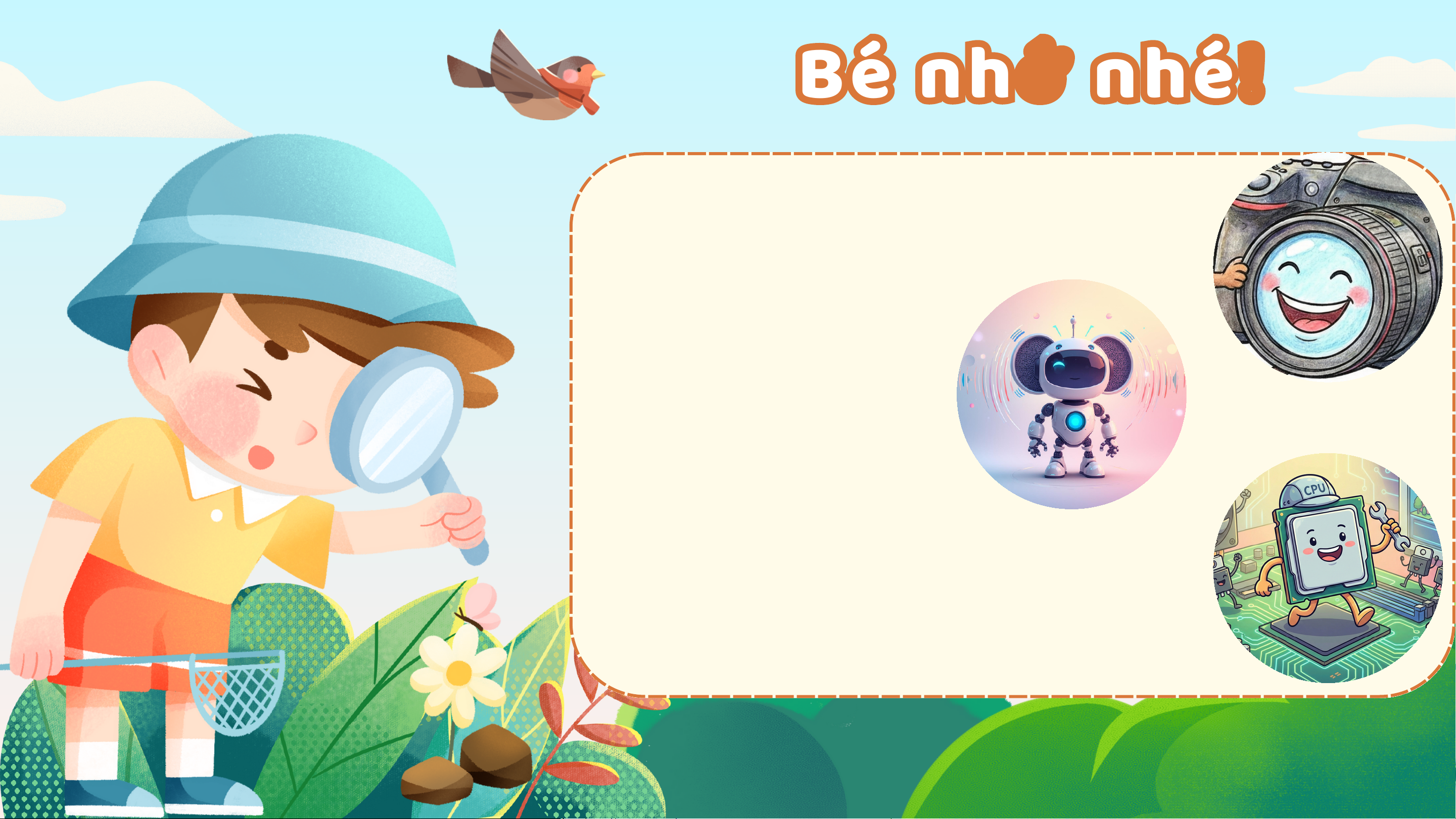 rồi! Lần sau tớ sẽ không quên đâu!" BẠN MÁY TÍNH GIÚP GÌ CHO BÉ? Mở khóa điện thoại: "A! Đúng là Máy tính thật sự mặt của bố rồi, mở là một người cửa ra nào!" bạn tuyệt vời (FaceID) trong cuộc sống Nghe lời bé: "Để hàng ngày của tớ bật nhạc Baby chúng ta phải Shark cho bé không nào? nghe nhé!" (Siri/Google) Bé nhớ nhé! Camera là mắt của bạn máy tính nè. Còn tai của máy tính gọi là Microphone nha! Bạn ấy hiểu biết và suy nghĩ bằng chip CPU đó. HÔM NAY BÉ ĐÃ HỌC ĐƯỢC GÌ RỒI NHỈ? HÃY KỂ CHO BA MẸ BIẾT VỚI NHÉ! CÂ C U Â U CH C U H Y U Ệ Y N Ệ N CỦ C A Ủ HÔ H M Ô M NA N Y A ĐẾ Đ N Ế N ĐÂ Đ Y Â LÀ L À KẾ K T Ế T TH T Ú H C Ú C RỒ R I Ồ !I HẸ H N Ẹ N GẶ G P Ặ P LẠ L I Ạ IBÉ V B À V O À O NH N Ữ H N Ữ G N G CÂ C U CHU Â Y CHU Ệ Y N Ệ N TI T Ế I P Ế P TH T E H O E NH N É H ! É