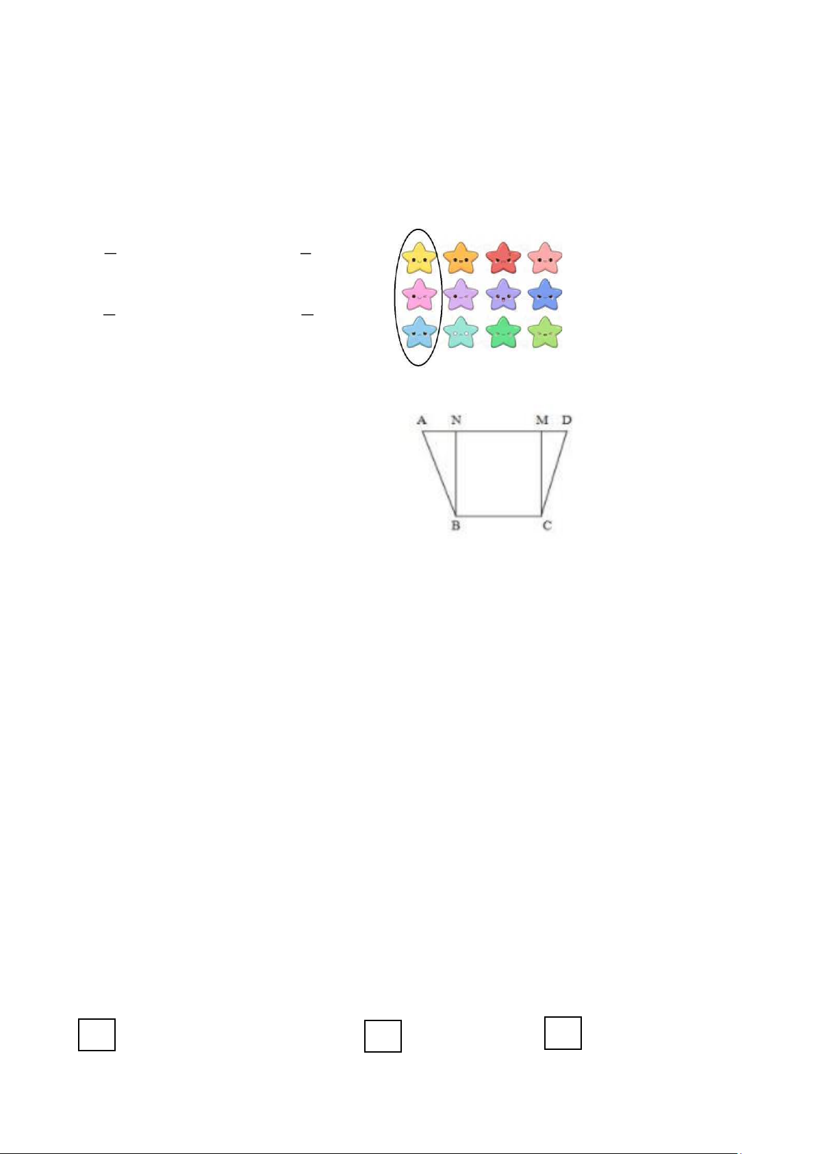 Câu 4: Hình dưới đây đã khoanh tròn vào một phần mấy số ngôi sao? 1 a) 2 1 b) 3 1 c) 4 3 d) 4