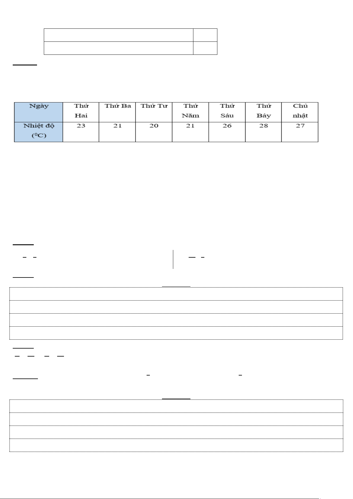 d) Trong tuần ngày có nhiệt độ thấp nhất là ngày thứ Tư (0,25đ) Câu 7