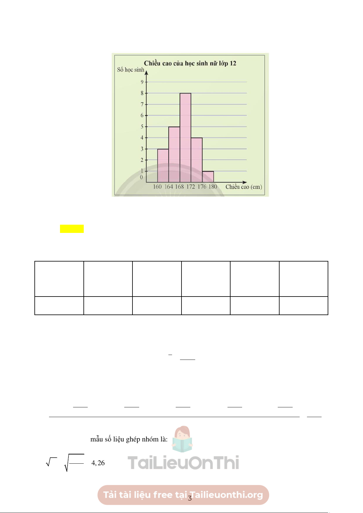 Phương sai của mẫu số liệu ghép nhóm là: 2 2 2 2 2 3550 3550 3550 3550 3550 3 162 − + 5 166 − +8 170 − + 4 174 − +1 178 − 21 21 21 21 21 8000 2 s = = 18,14 21 441