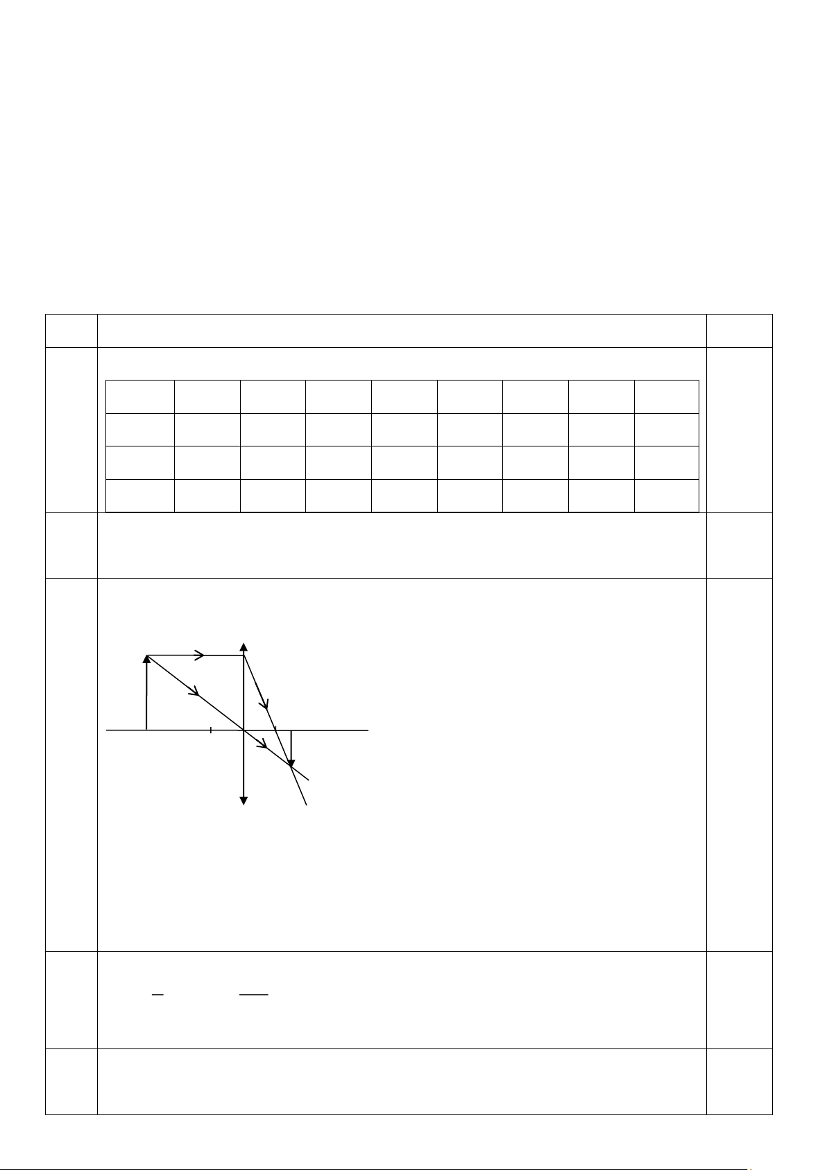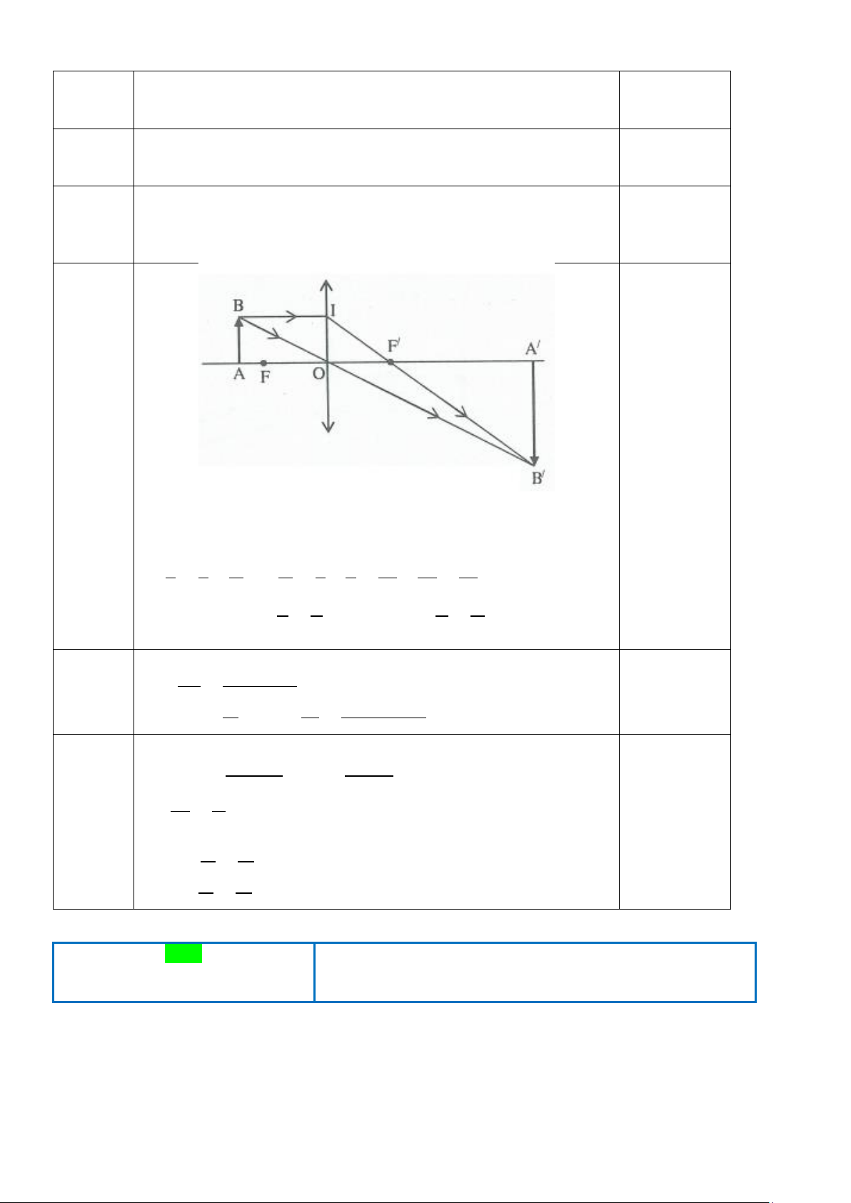 ................Hết............... ĐÁP ÁN Câu Nội dung Điểm Trắc Câu 1 2 3 4 5 6 7 8 0.25đ/ý nghiệm = 4,0đ Đáp án C A A A B A B C Câu 9 10 11 12 13 14 15 16 Đáp án B B B A C B A C Tự luận 1 - Vẽ hình đúng. I B F’ O A’ A F 1đ B ’