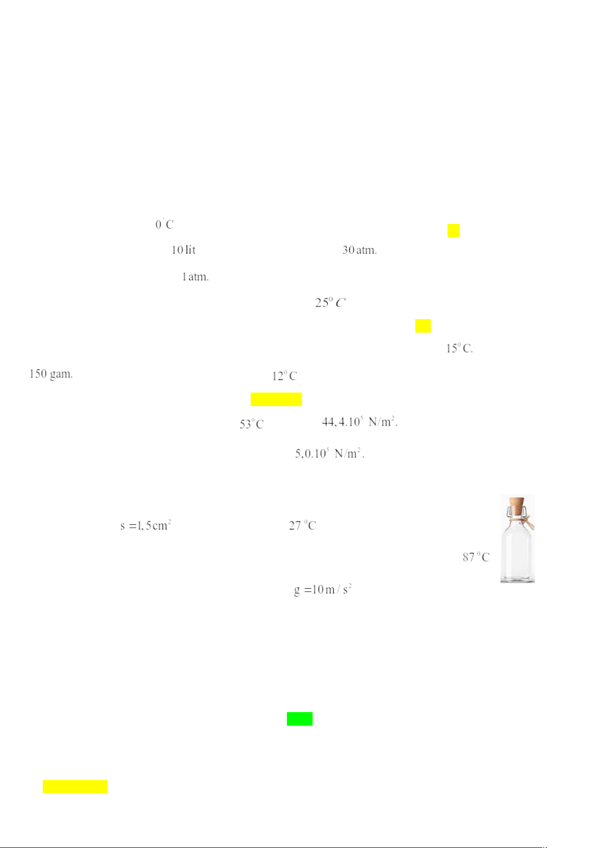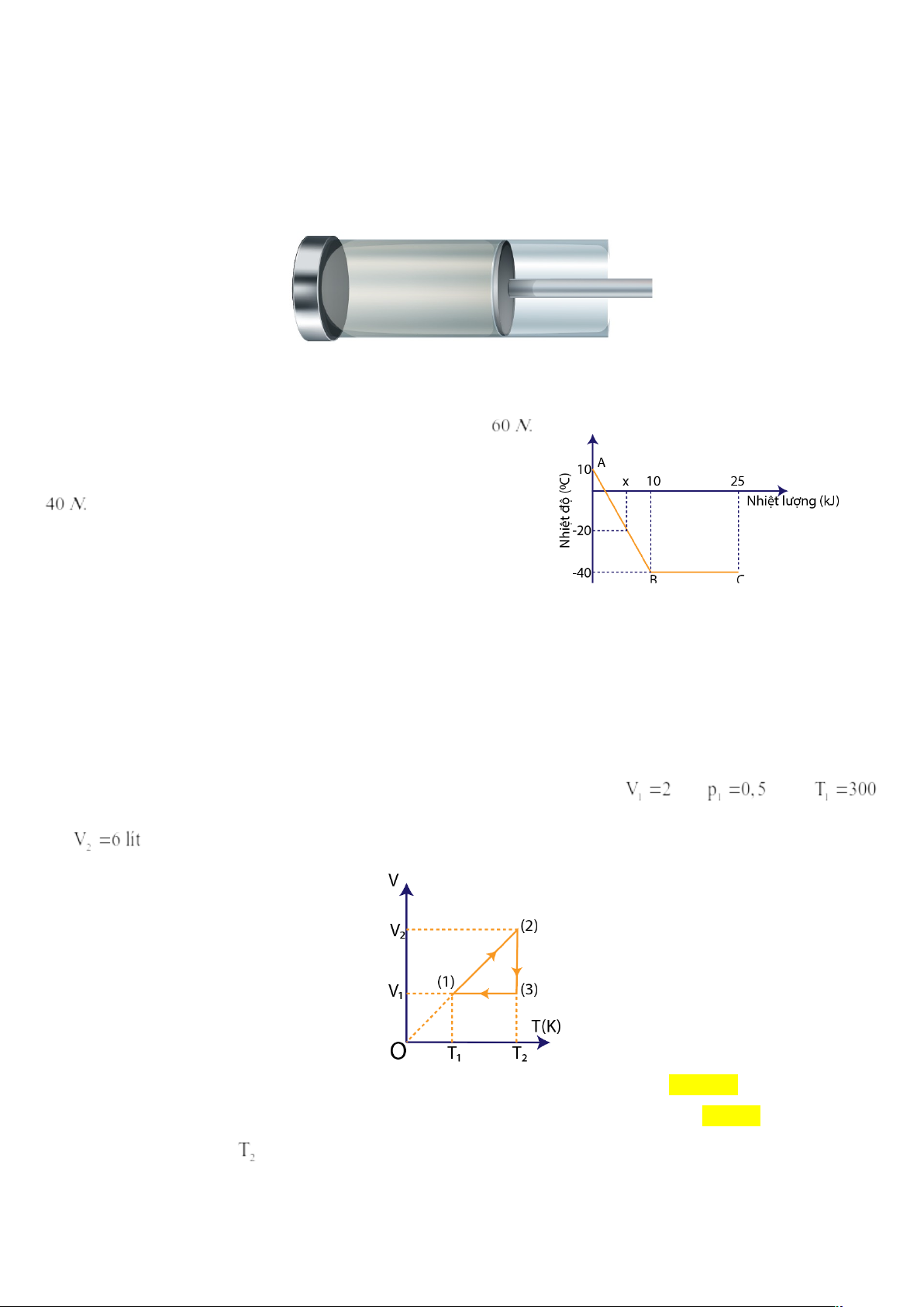 Câu 2. Một xilanh đặt thẳng đứng, diện tích tiết diện là S = 100 cm2, chứa không khí ở nhiệt độ t1 = 27oC. Ban đầu xilanh được đậy bằng một pittông cách đáy h = 50cm. Pittông có thể trượt không ma sát dọc theo mặt trong của xilanh.Đặt lên trên pittông một quả cân có trọng lượng P = 500N. Pittông dịchchuyển xuống đoạn rồi dừng lại. Biết áp suất khí quyển là p0 = 105N/m2. Bỏ qua khối lượng của pittông. Nhiệt độ của khí trong xilanh theo thang nhiệt Celsius sau khi pittông dừng lại là bao nhiêu? 87