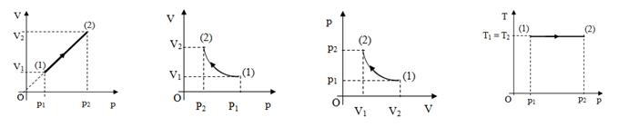 Câu 9: Cho một quá trình được biểu diễn bới đường cong hypebol trong đồ thị như hình vẽ. Các thông số trạng thái p, V, T của hệ đã thay đổi như thế nào khi đi từ trạng thái 1 sang trạng thái 2?