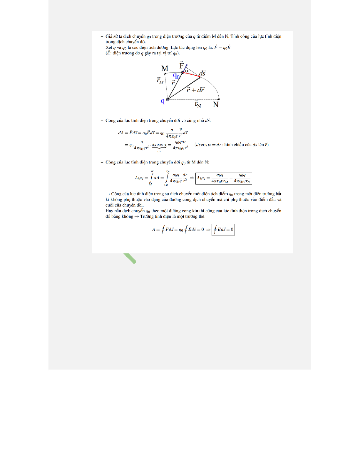 Câu 15: Tính công của lực tĩnh điện khi dịch chuyển điện tích điểm q 0