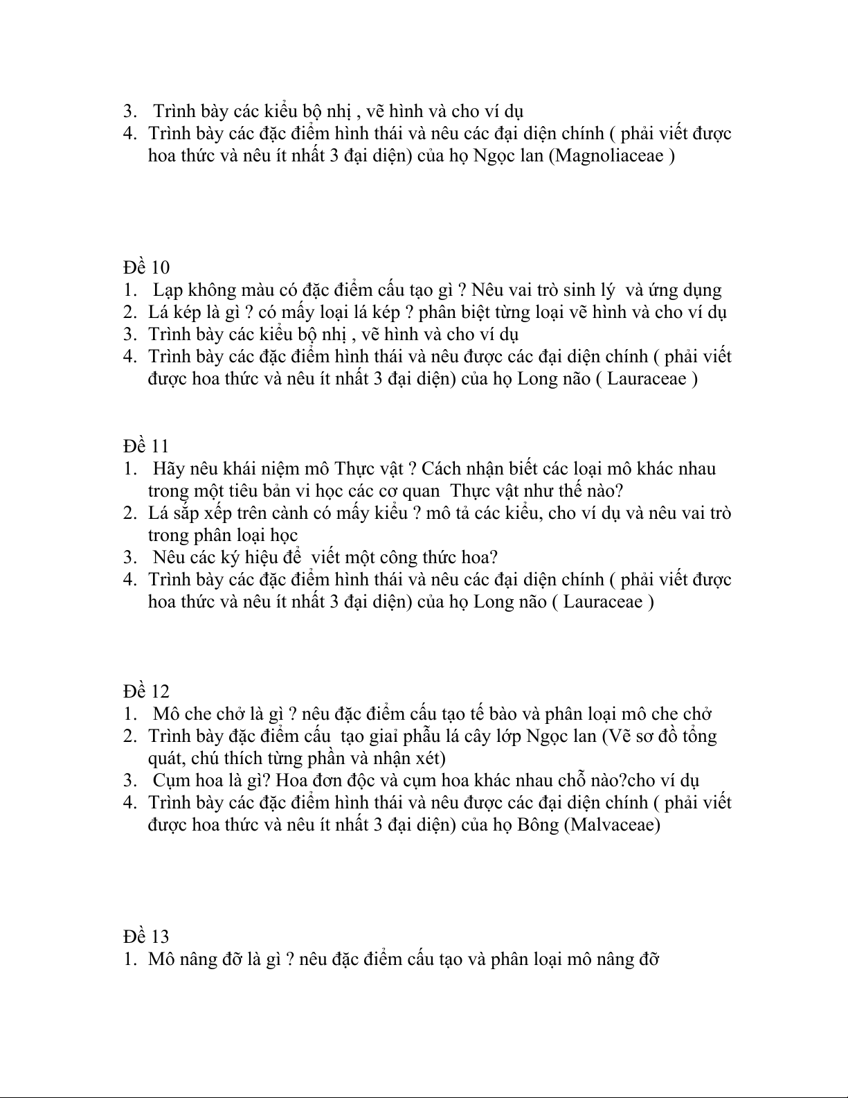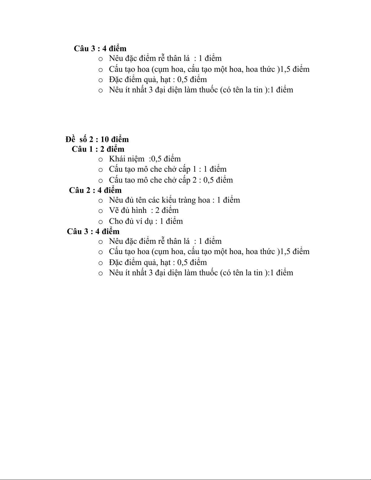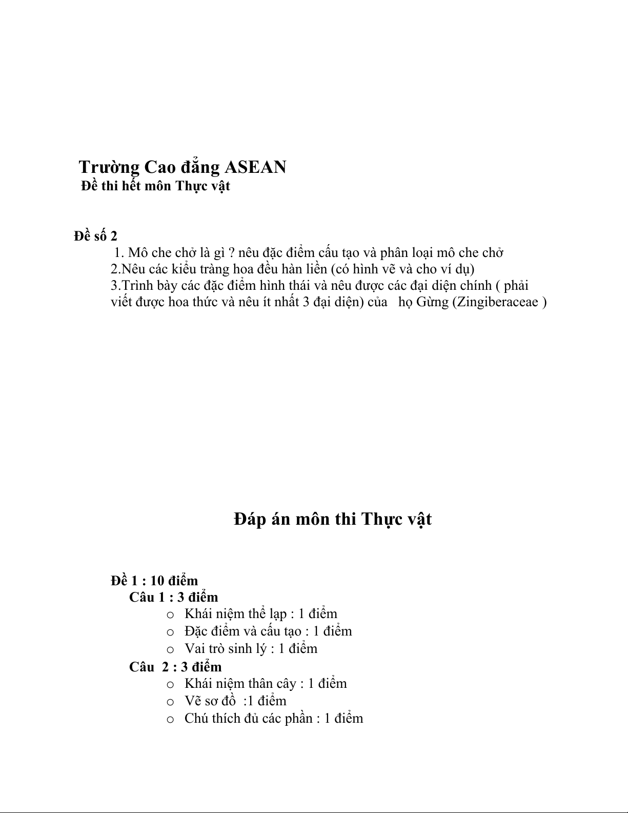 Đáp án môn thi Thực vật Đề 1 : 10 điểm Câu 1 : 3 điểm o