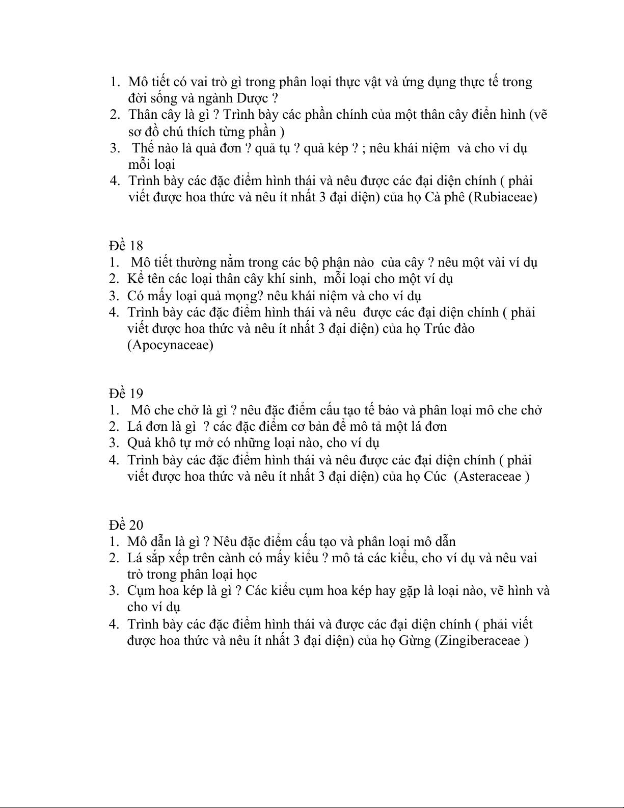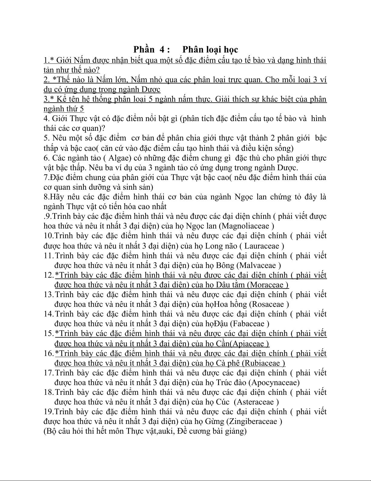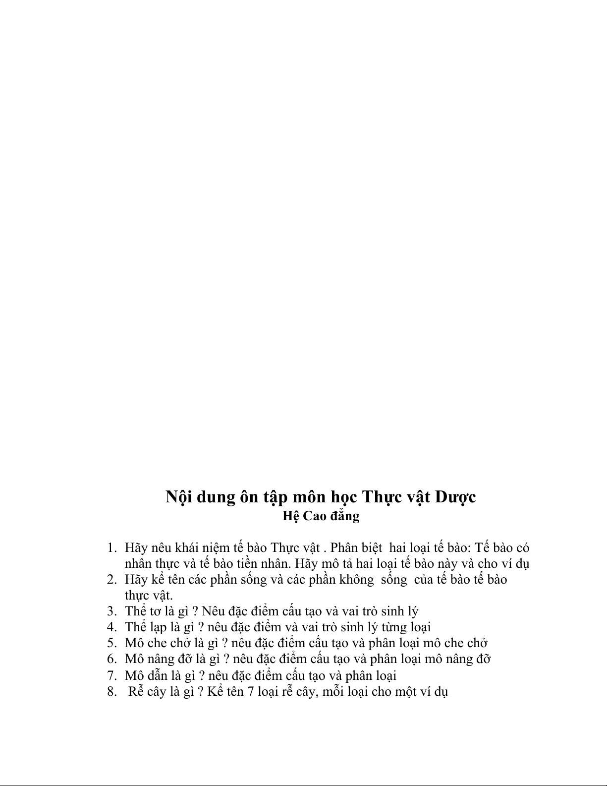 Nội dung ôn tập môn học Thực vật Dược Hệ Cao đẳng