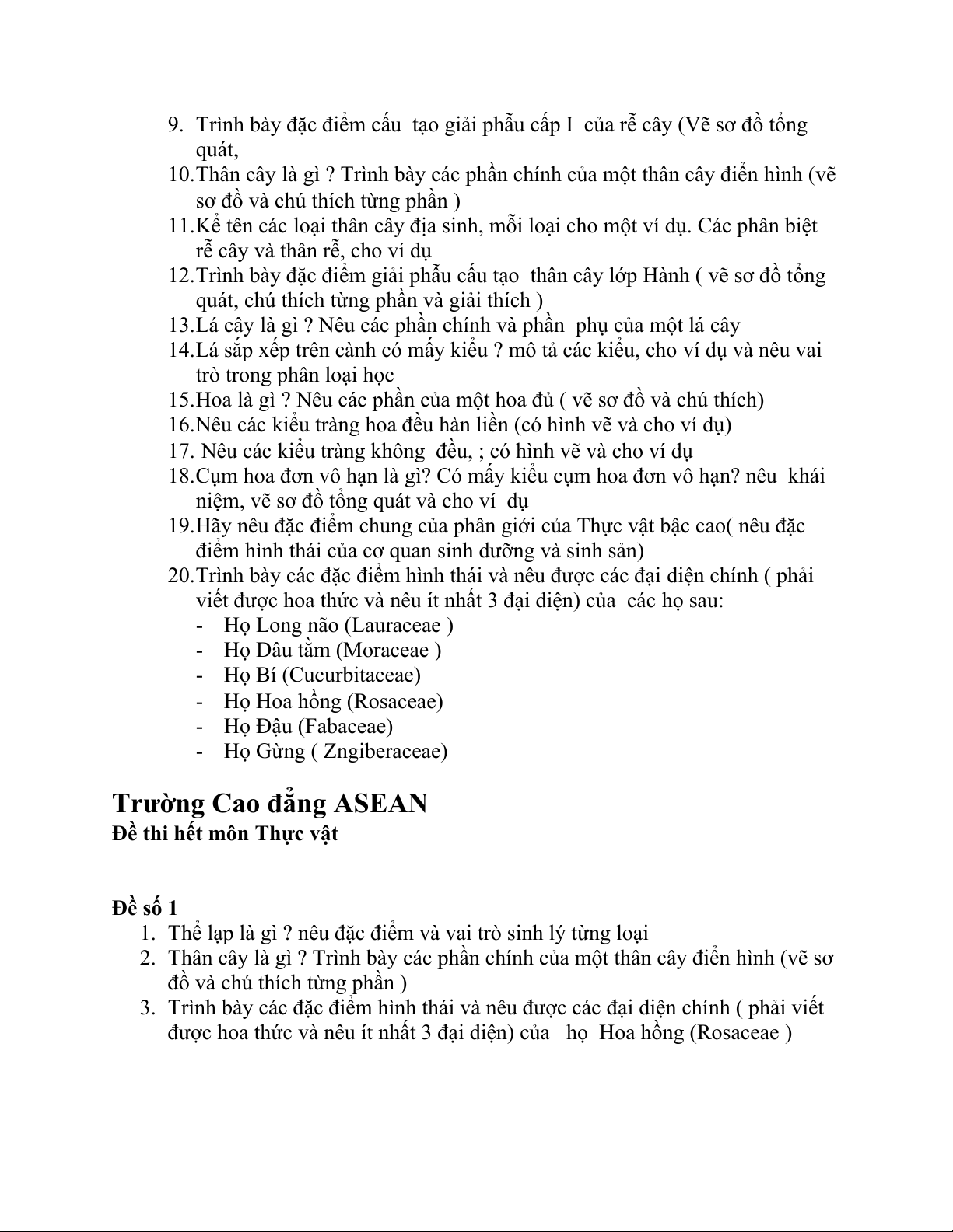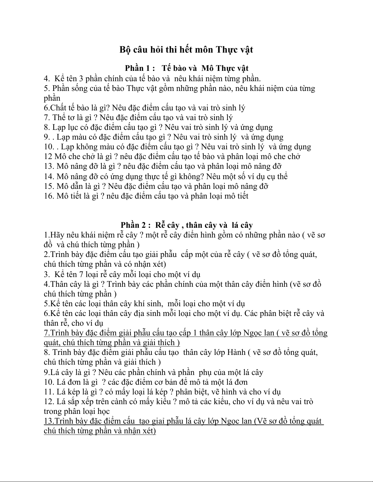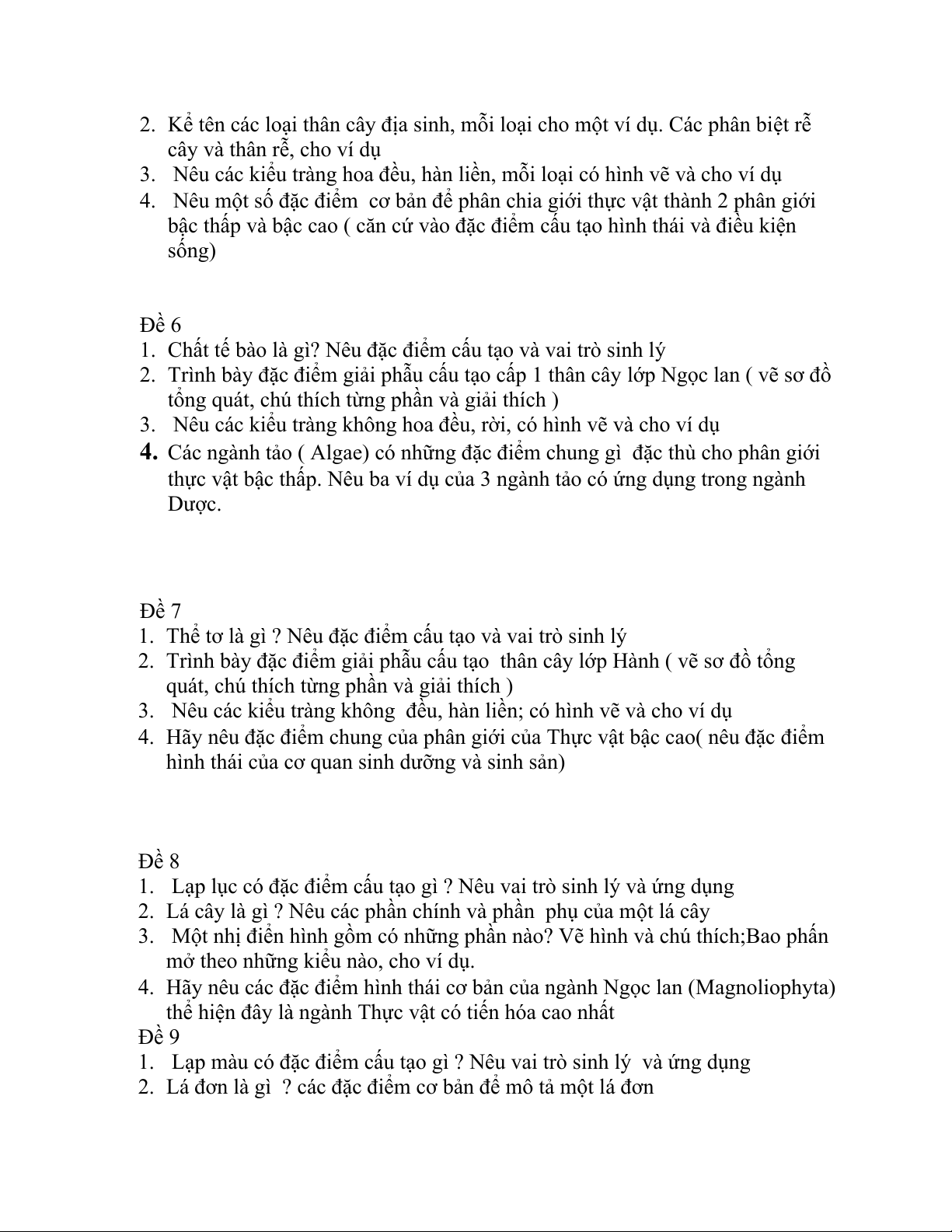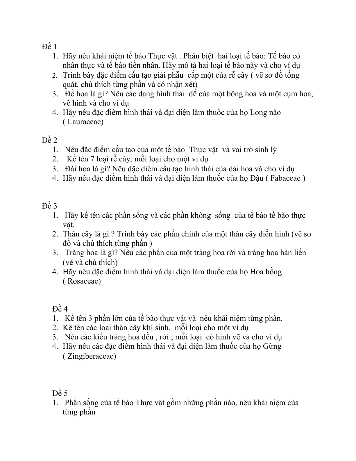 Nội dung ôn tập môn học Thực vật Dược Hệ Cao đẳng