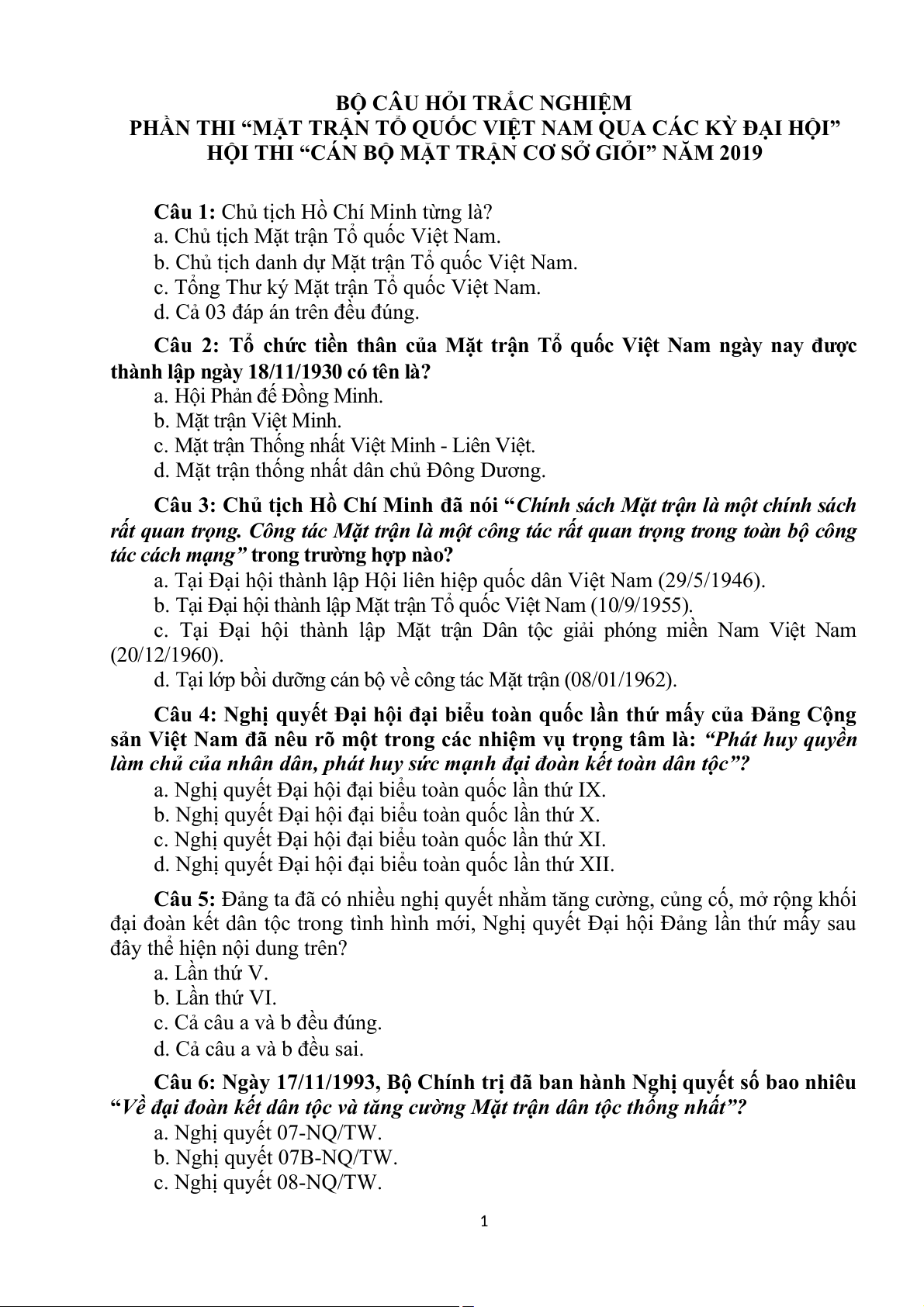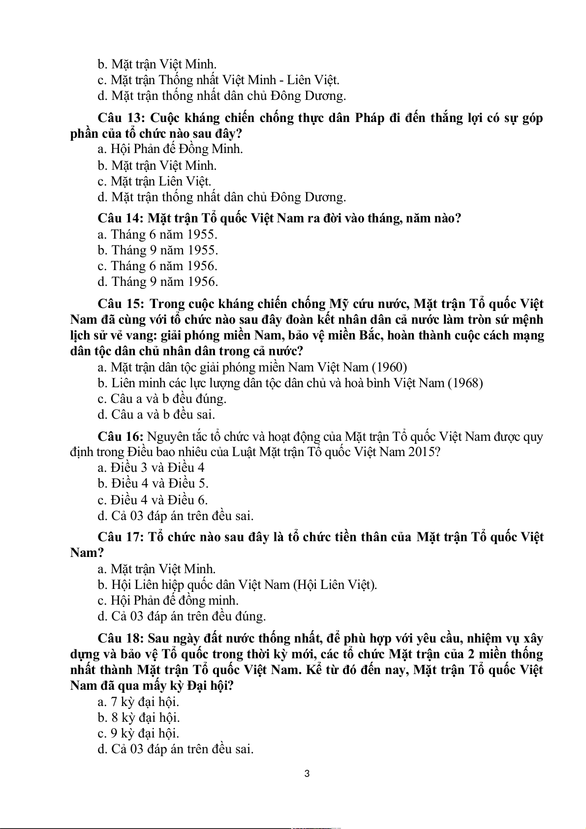 Câu 17: Tổ chức nào sau đây là tổ chức tiền thân của Mặt trận Tổ quốc Việt Nam? a. Mặt trận Việt Minh.