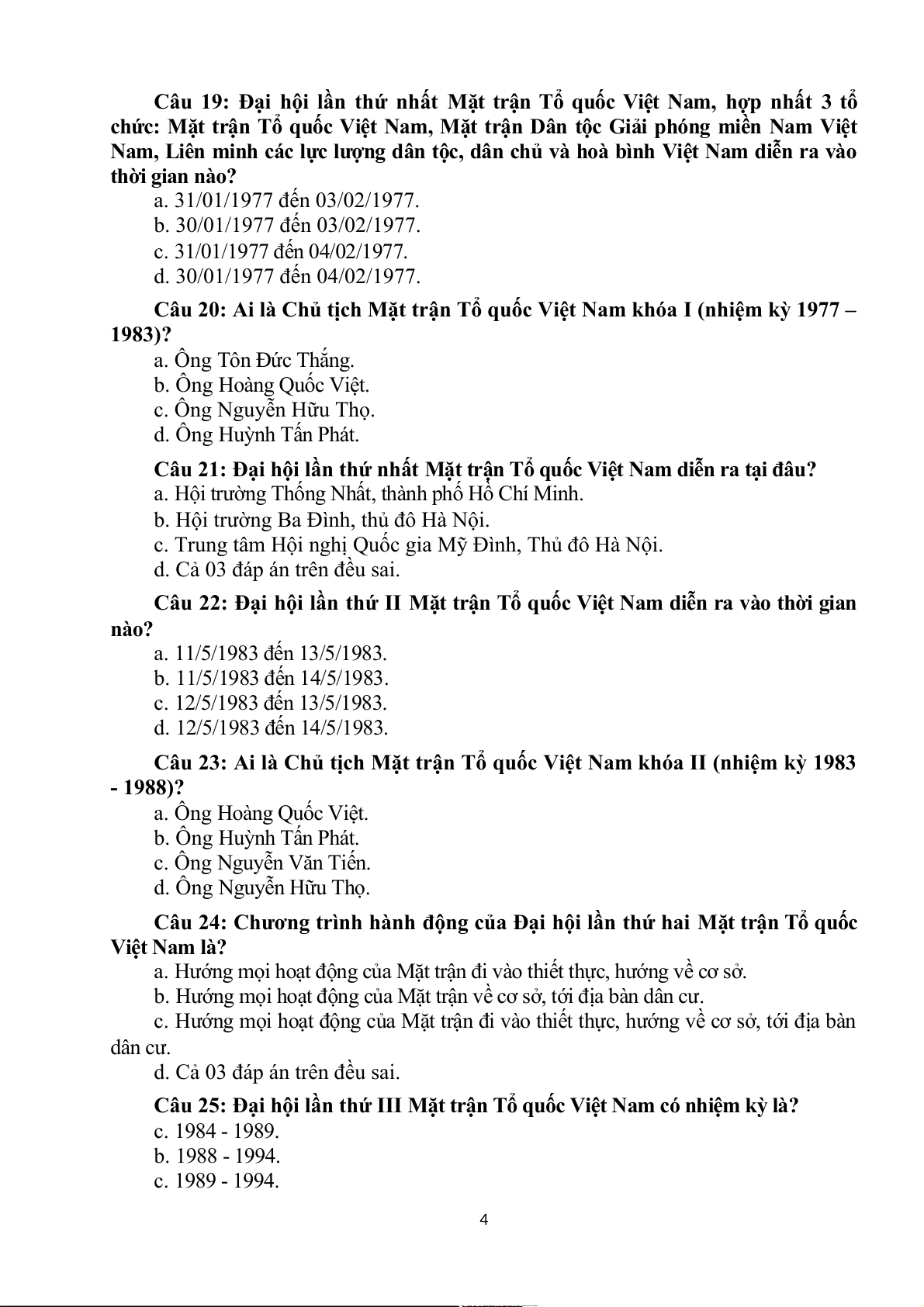 Câu 20: Ai là Chủ tịch Mặt trận Tổ quốc Việt Nam khóa I (nhiệm kỳ 1977 – 1983)? a. Ông Tôn Đức Thắng. b. Ông Hoàng Quốc Việt. c. Ông Nguyễn Hữu Thọ. d. Ông Huỳnh Tấn Phát.