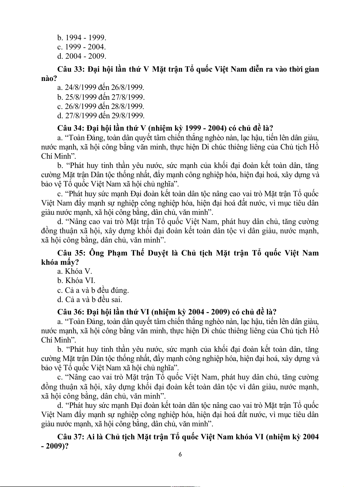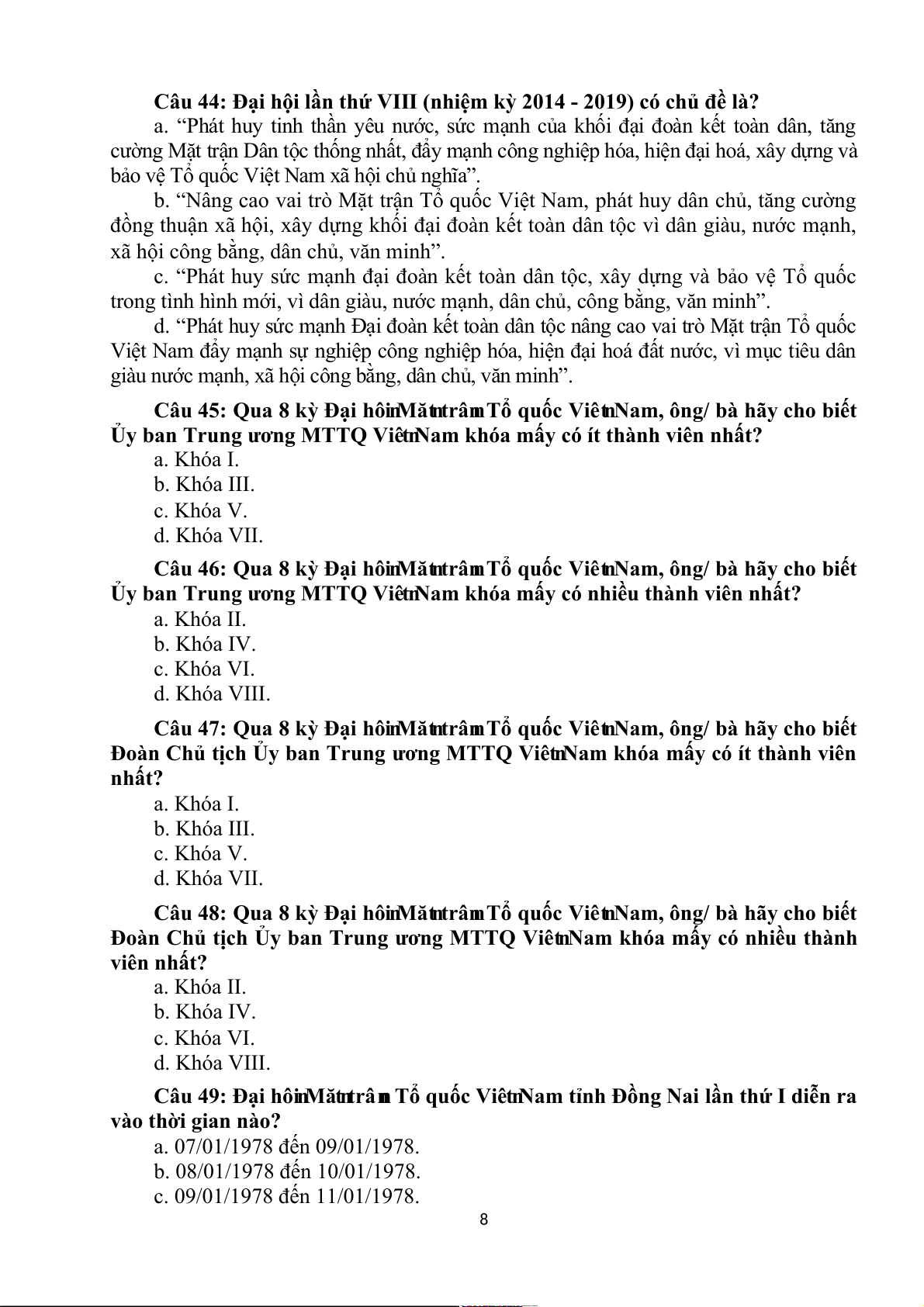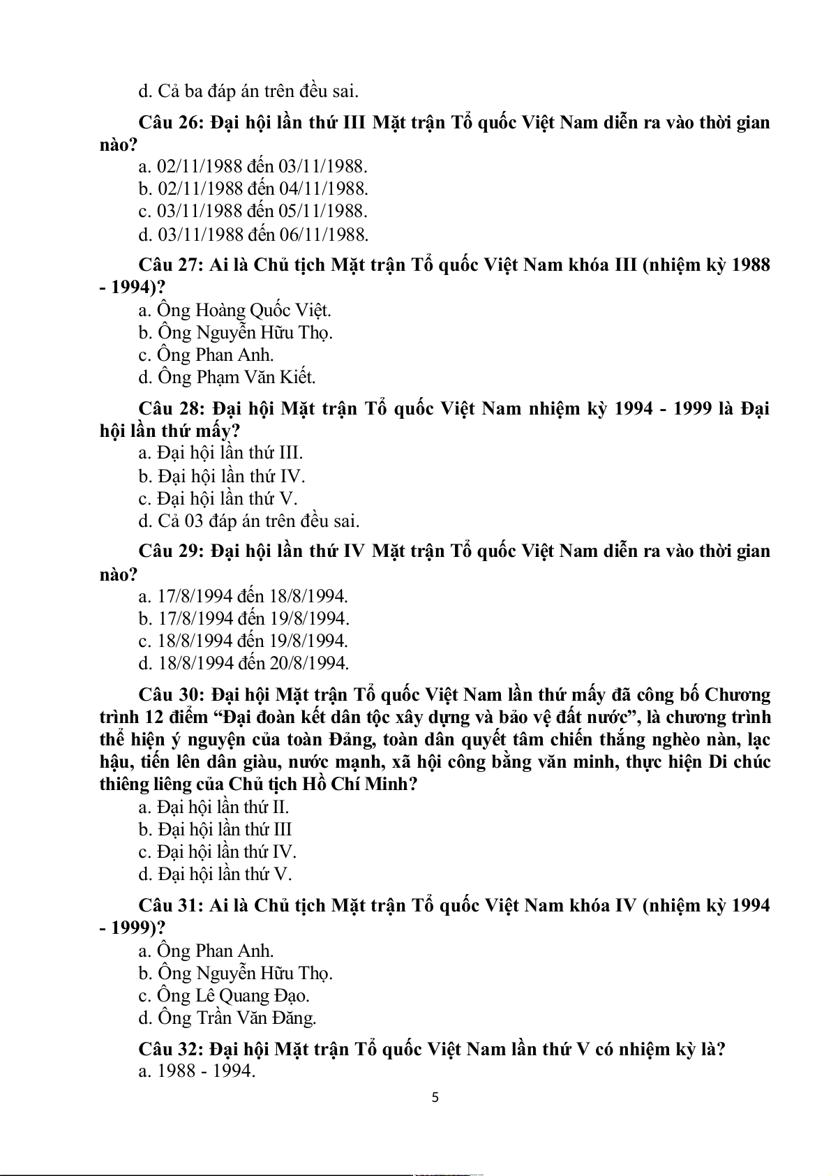 d. 10/01/1978 đến 12/01/1978. Câu 50: Đại hô n i Mă n t trâ n n Tổ quốc Viê n