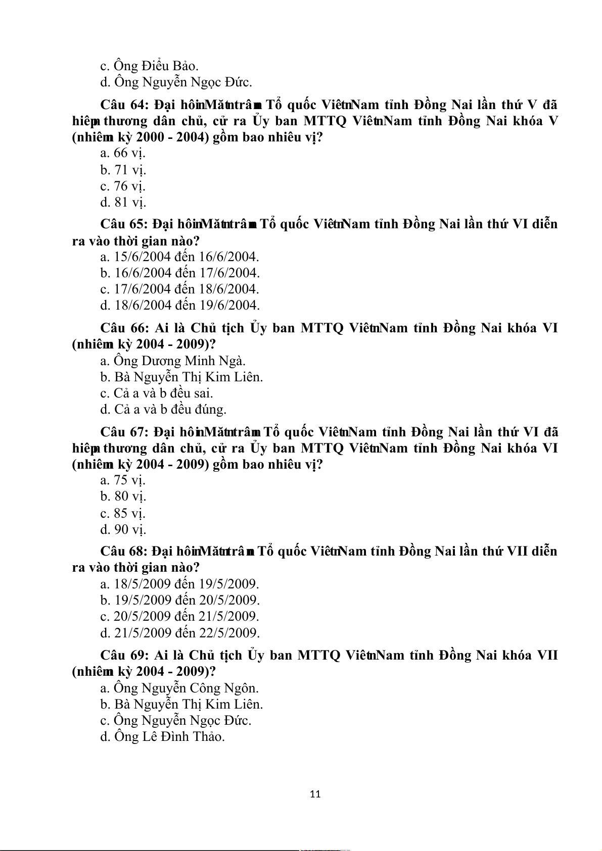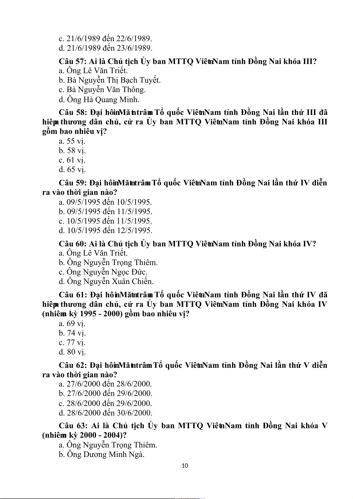 t Nam t†nh Đồng Nai khóa III gồm bao nhiêu vị? a. 55 vị. b. 58 vị. c. 61 vị. d. 65 vị. Câu 59: Đại hô n i Mă n t trâ n n Tổ quốc Viê n