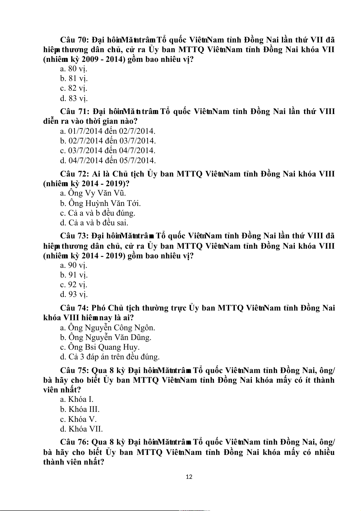t Nam t†nh Đồng Nai khóa VIII (nhiê n m kỳ 2014 - 2019)? a. Ông Vy Văn Vũ. b. Ông Huỳnh Văn Tới. c. Cả a và b đều đúng. d. Cả a và b đều sai. Câu 73: Đại hô n i Mă n t trâ n n Tổ quốc Viê n