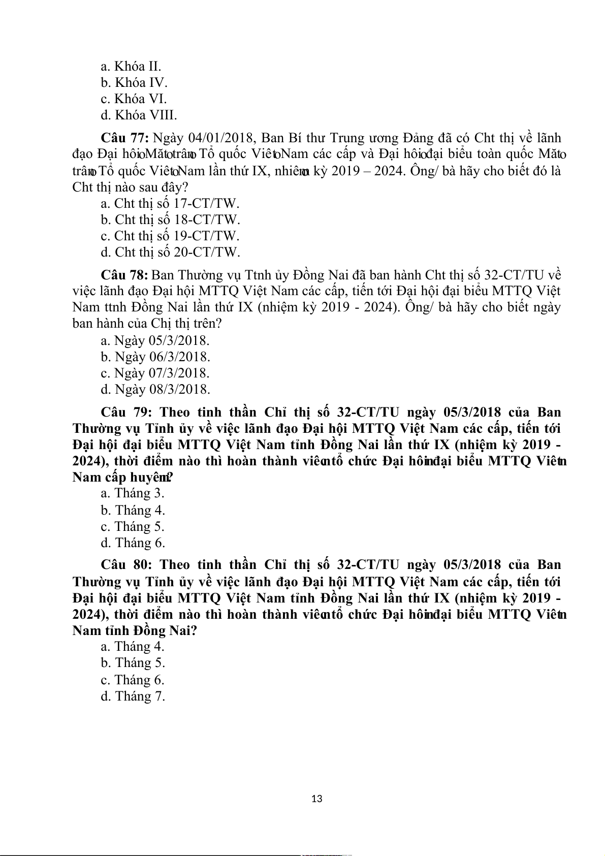 Câu 77: Ngày 04/01/2018, Ban Bí thư Trung ương Đảng đã có Cht thị về lãnh đạo Đại hô o i Mă o t trâ o n Tổ quốc Viê o t Nam các cấp và Đại hô o
