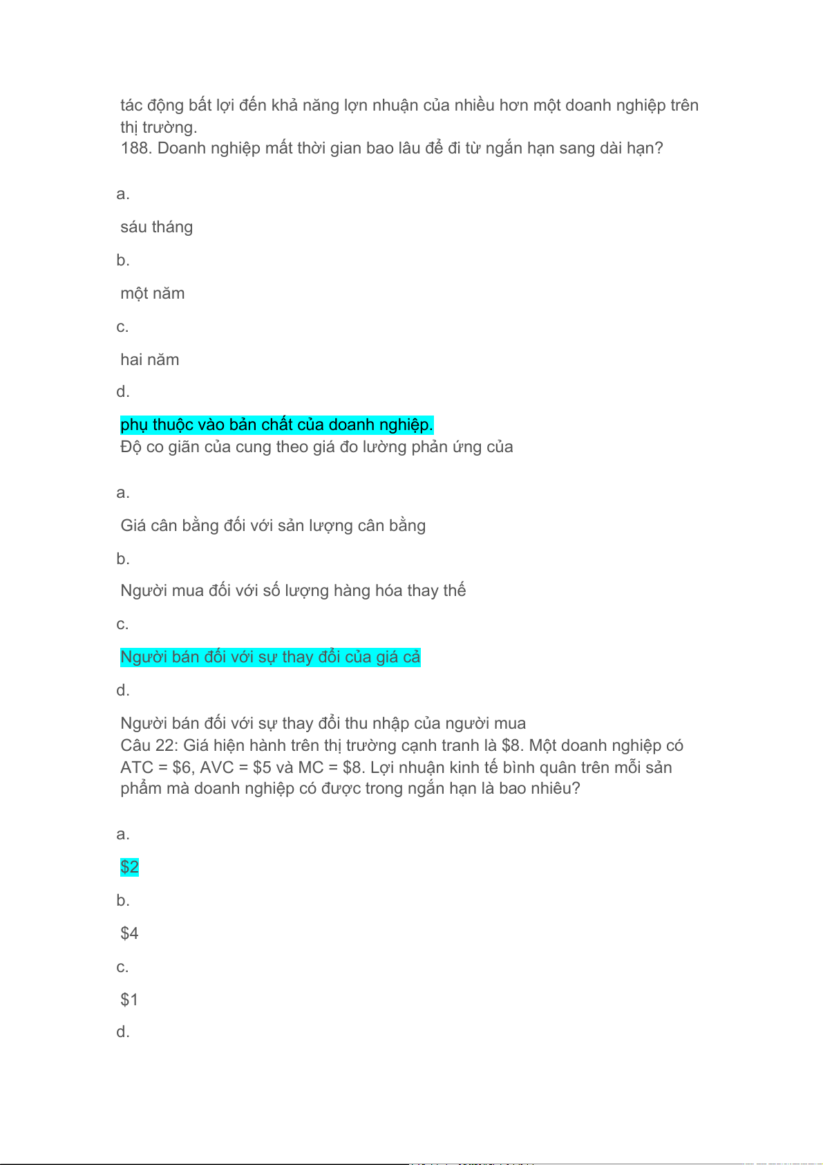 188. Doanh nghiệp mất thời gian bao lâu để đi từ ngắn hạn sang dài hạn? a. sáu tháng b. một năm c. hai năm d.